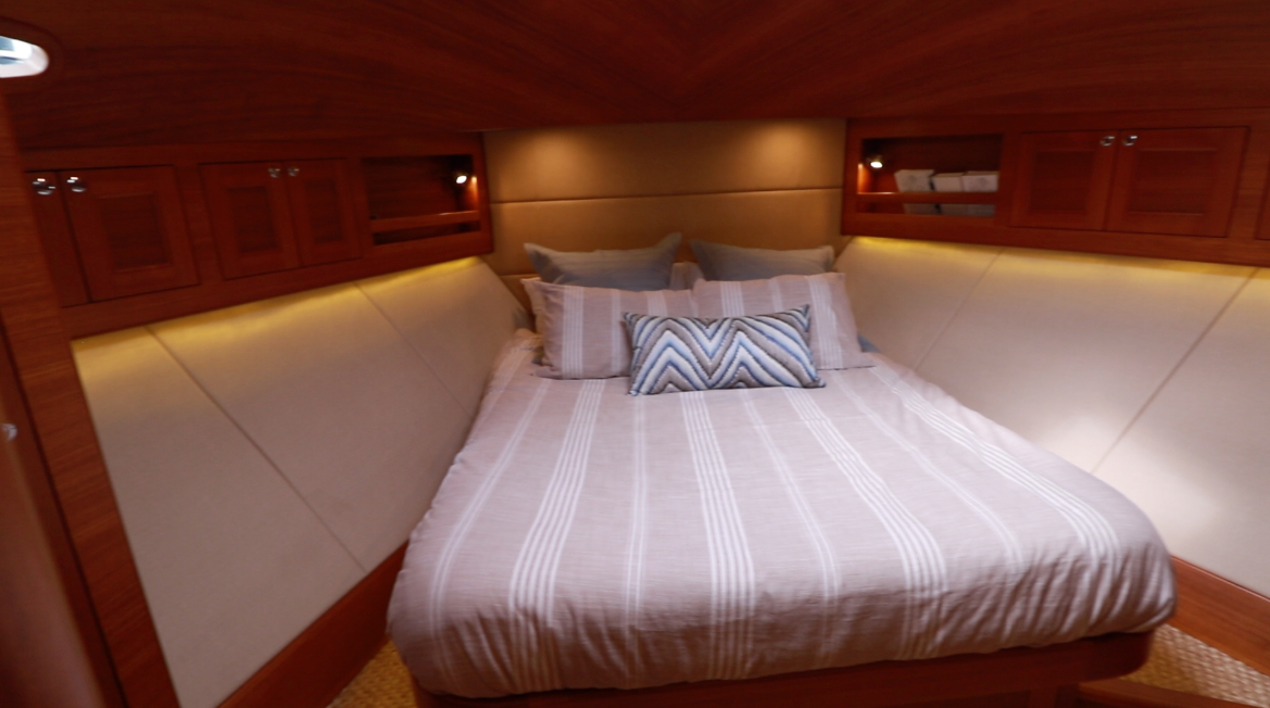 Moving to the starboard side, we come to the master stateroom. It’s certainly open and well-lit thanks to the skylight up above. The top side of the skylight is just ahead of the helm station. There’s an island berth measuring 75” x 59” (190.50 cm x 149.86 cm) that is accessible from all sides. There's a 42” (106.68 cm) TV on the bulkhead just ahead of the berth. Continuing aft, there’s a 6” (15.24 cm) step down. Ceiling height is 6’8" (2.03 m) before we come to that step.