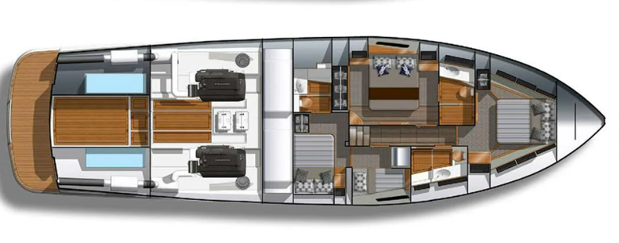 Most noticeable, the additional interior volume of the GB62 allows for an enlarged starboard guest stateroom with an athwartships double bed and a single, as well as a utility area that incorporates the standard washer/dryer.