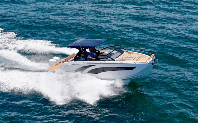 New to the U.S., but not to Brazil, the Hanover 347 is an entertainment platform by day and a cozy escape by night with two cabins that sleep up to four. The cockpit is large her faux teak decks, butcher-block tables and fine upholstery work give this open express an upscale feel.