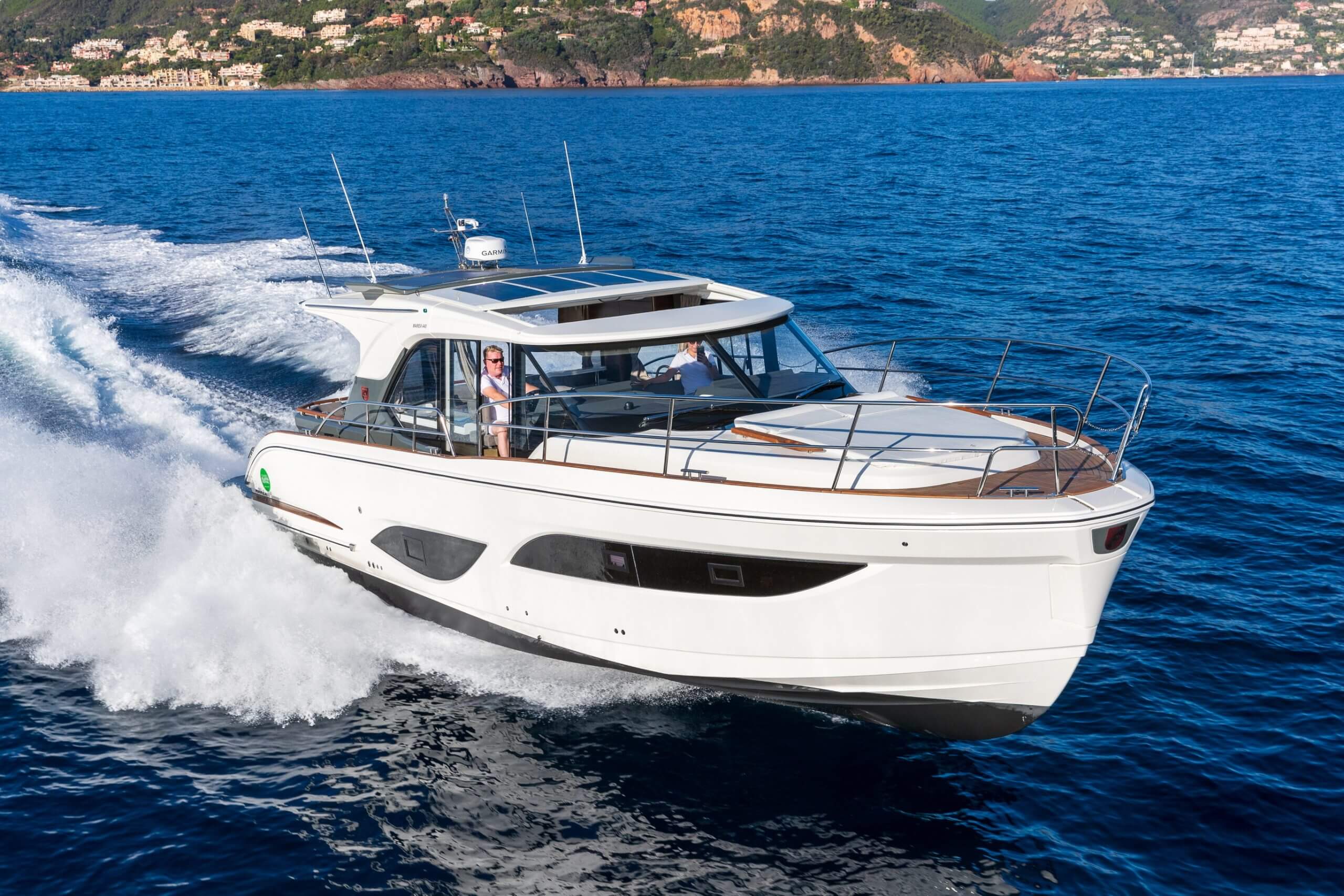 The Marex 440 Gourmet Cruiser lives up to its name with a kitchen layout that any chef would appreciate. Marex has created an enormous U-shaped kitchen—the largest in its class—featuring an oven/microwave, double sink, induction cooker, and a dishwasher. A unique opening in the countertop provides storage for up to 43 drinks. The boat is equipped with a solar panel that generates enough power to keep the 220-liter refrigerator and 100-liter freezer running without relying on shore power. This level of self-sufficiency provides greater freedom on the water.