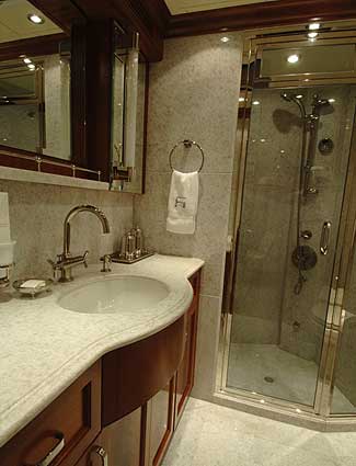 - Walk thru molded FRP shower stall with frameless glass doors accessed from both heads