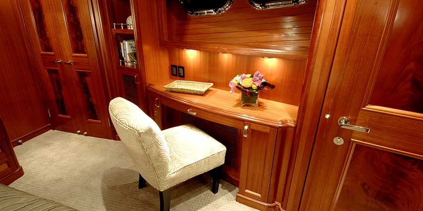 - Book shelves and lockers outboard of lower berth