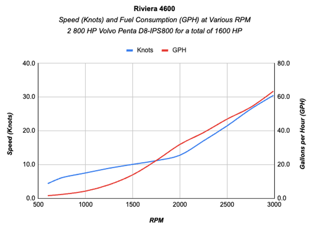 The Riviera 4600 has an effective range between 218 nm and 1,332 nm with a 10% fuel reserve. At a cruise speed of 26.5 knots, she has a range of 245 nm.