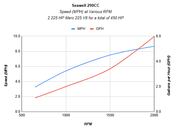 The SeaWell 290CC proved to be a spirited performer on the day of our sea trial. We had two people aboard, 60% of fuel and a test weight of 5,200 lbs. (2,358.68 kg). With the throttles nailed at 5500 rpm, we hit a top speed of 47.9 mph and a best cruise at 3000 rpm, traveling at a comfortable 23.6 mph. On our out-of-the-hole shots, we hit 30 mph after 9.4 seconds.