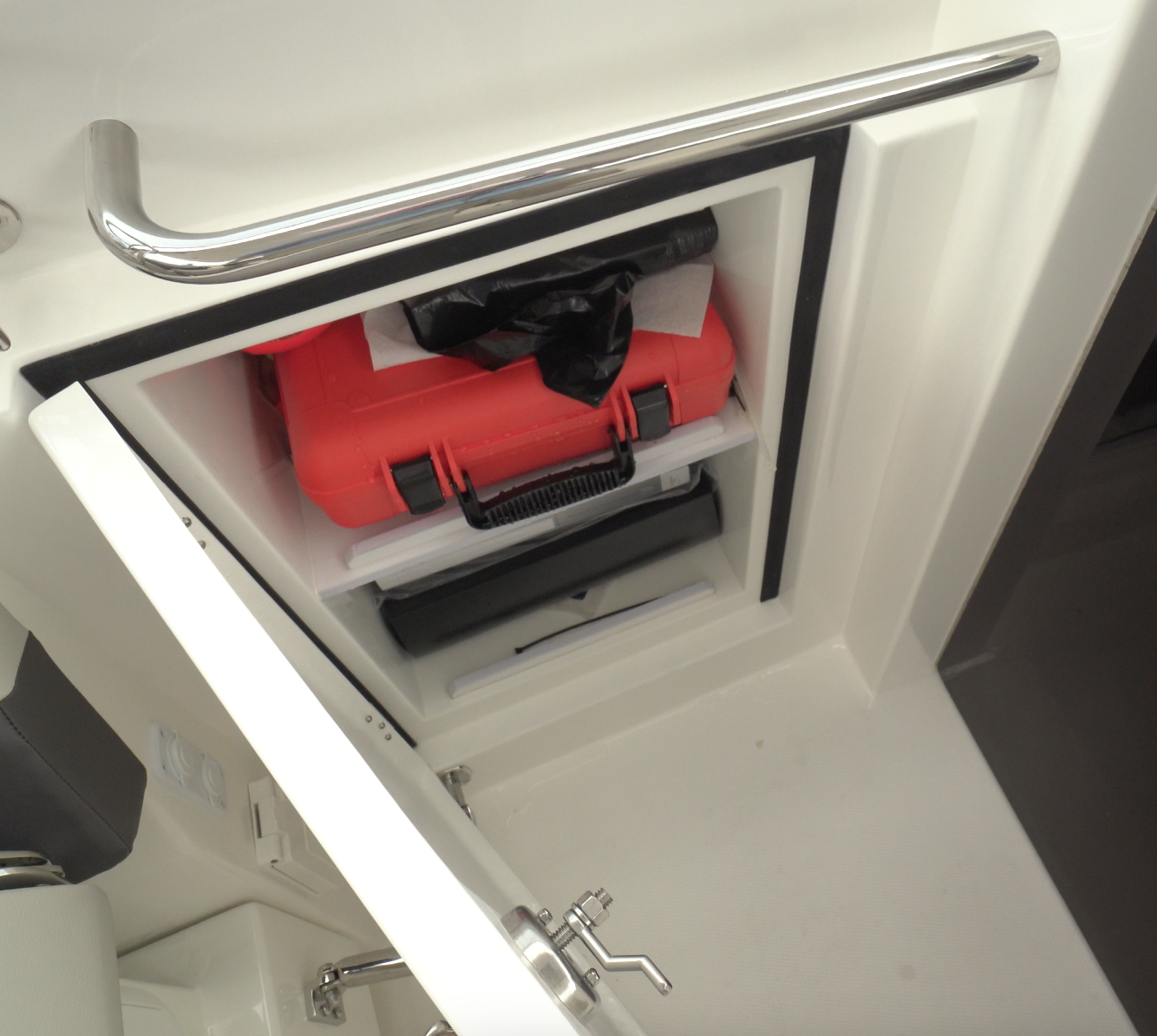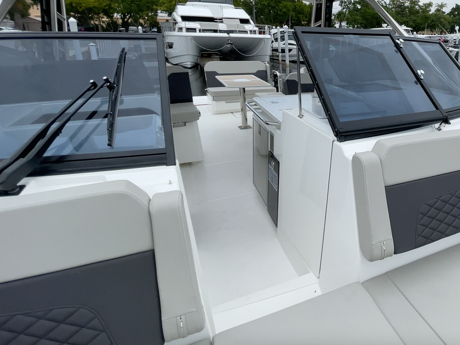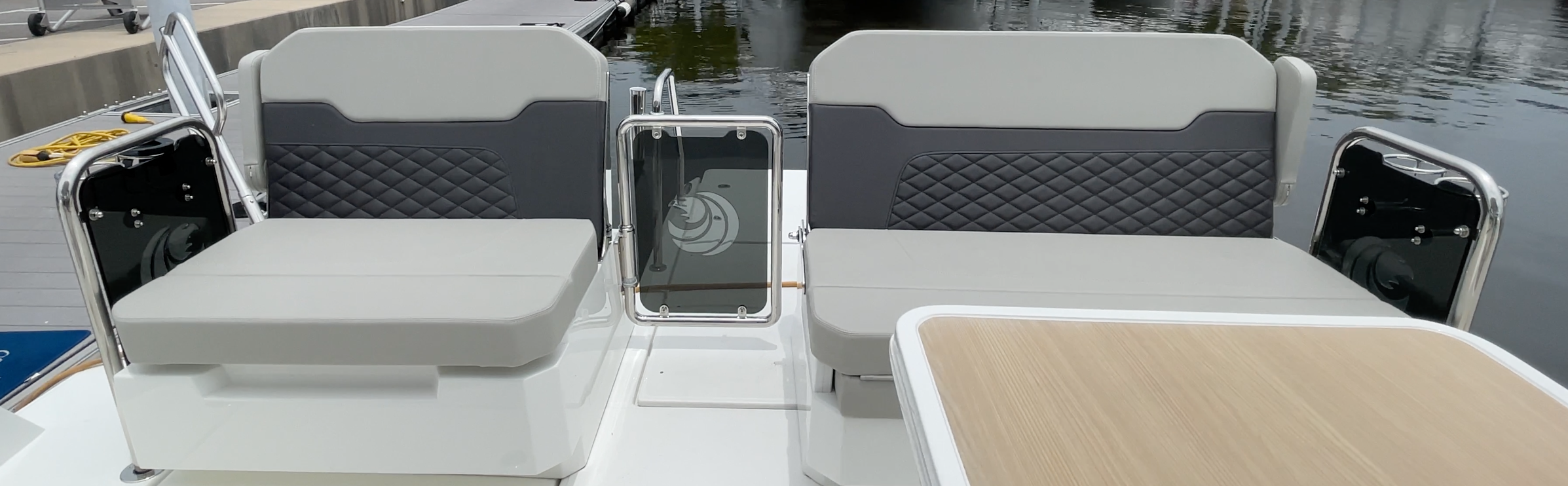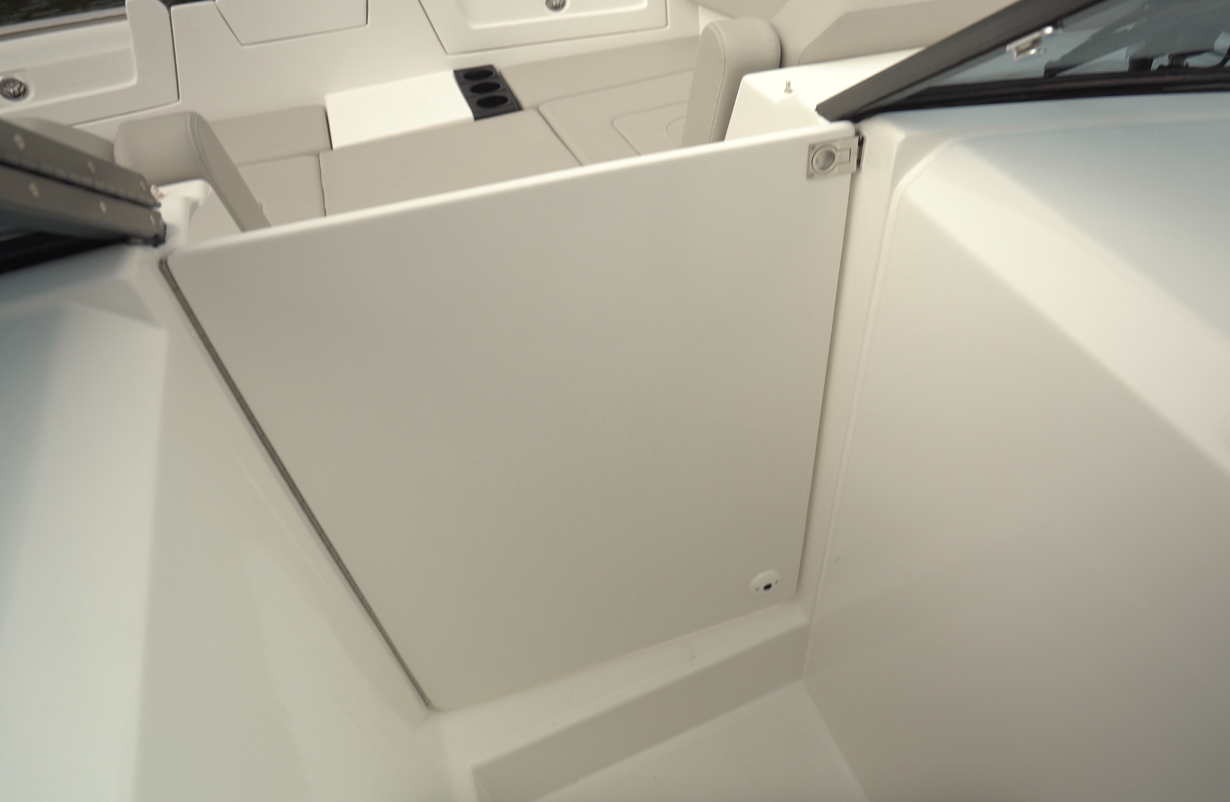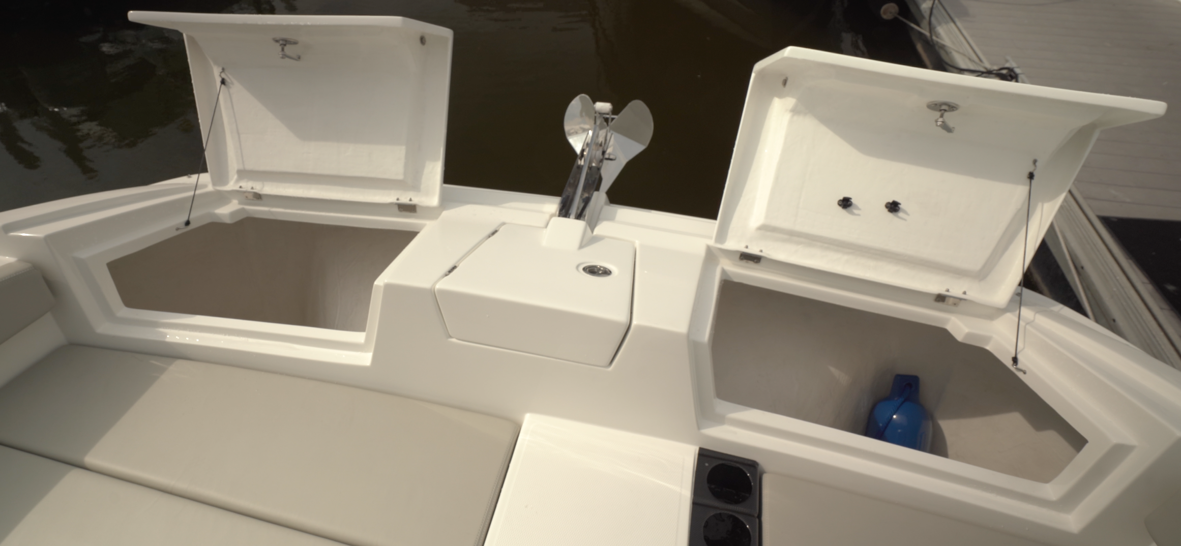 There’s deep storage beneath starboard seat-bottom cushion and forward on each side of the Quick windlass are two large lockers. There are also four 9” (22.86 cm) pull-up cleats in the bow, two on the side and two on the leading edge of the hull.