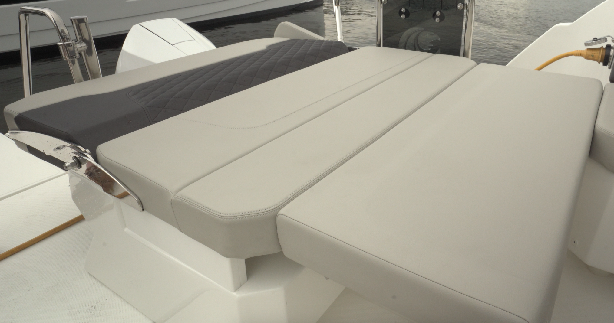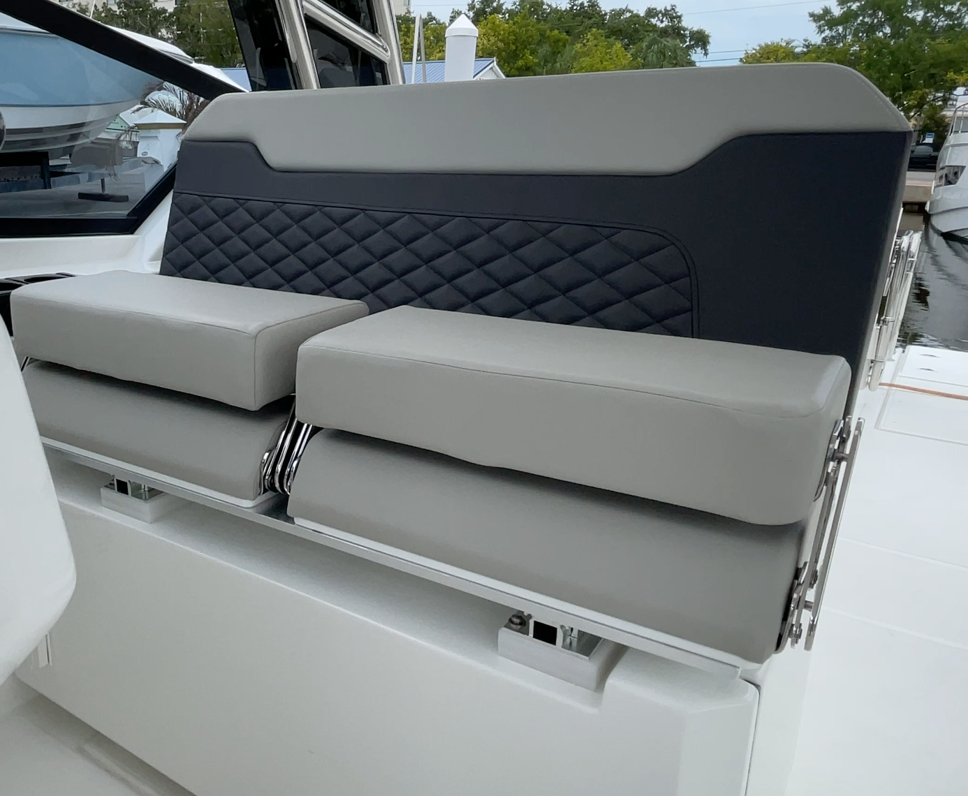 The helm seat is 45” (114.3 cm) wide and has individual flip-up bolsters. The companion seat to port has a convertible backrest, a flip bolster and the aforementioned folding footrest.