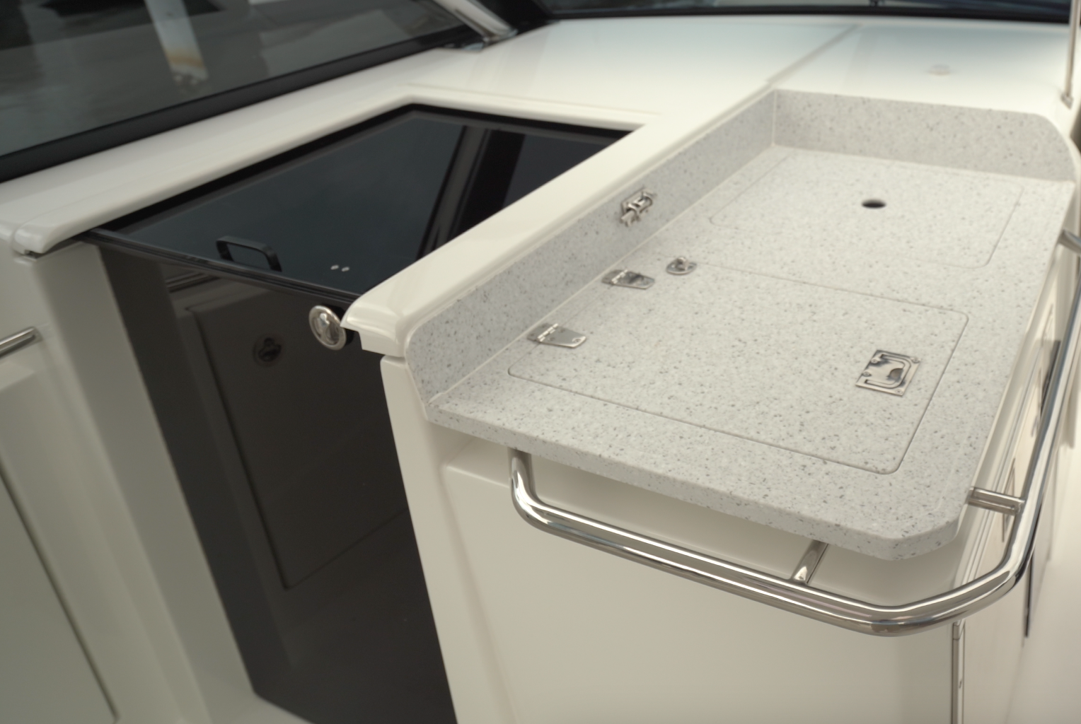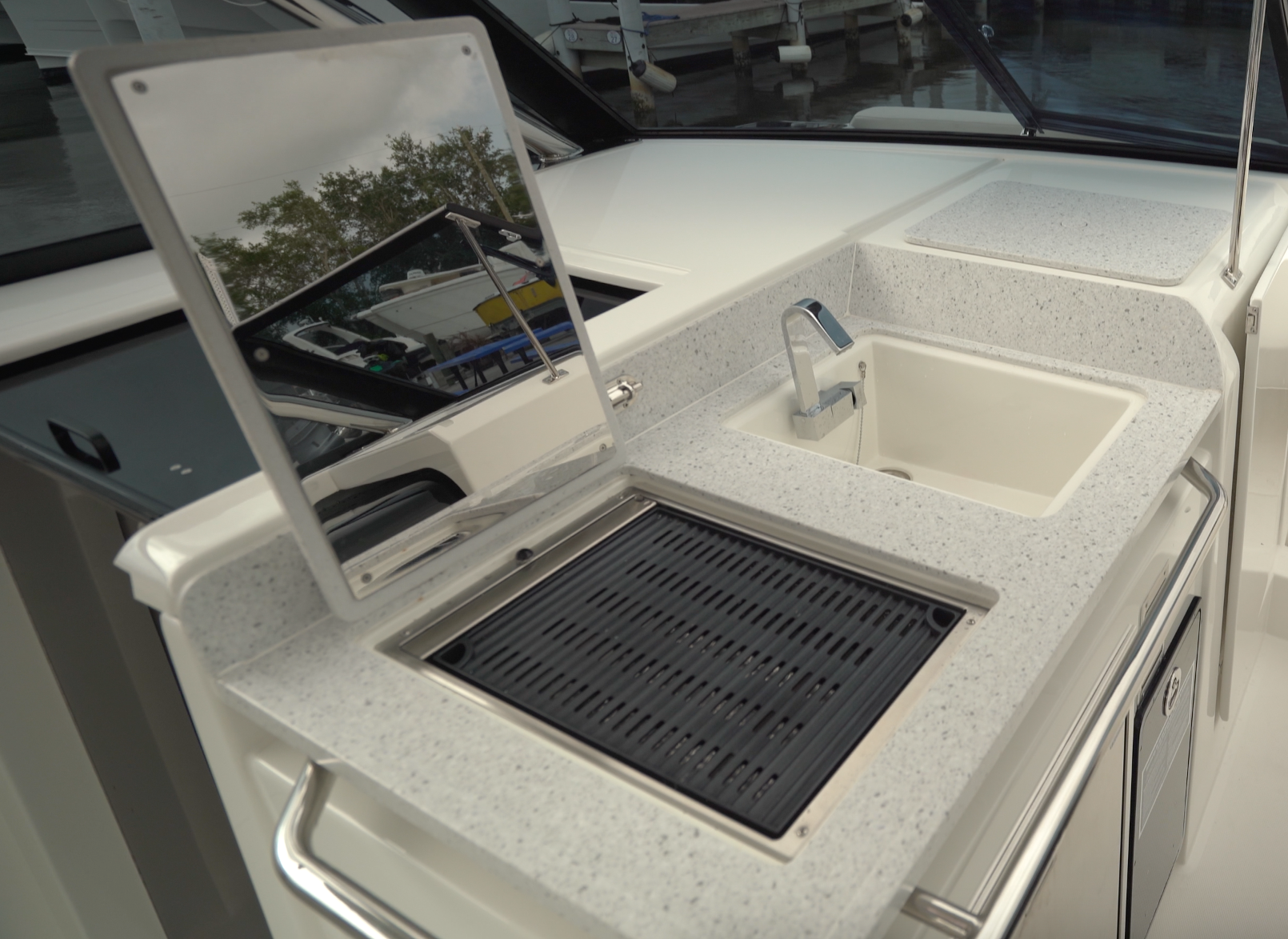 It’s a 6” (15.24 cm) step down to the cockpit deck. Before we enter the cockpit to port in the passageway is a galley with a sink beneath a removable cover. When the cover is removed, there’s a short post on the forward counter that the cover can be secured with. Aft, the electric grill can be operated off an inverter or the 5kW diesel generator. We like the positioning of the grill because the cook can work from the aft end, leaving the passageway open. There’s a refrigerator in the counter beneath the stove and a wastebasket is beneath the sink. A rail runs the length of the galley to help guests stay secure in bumpy conditions.