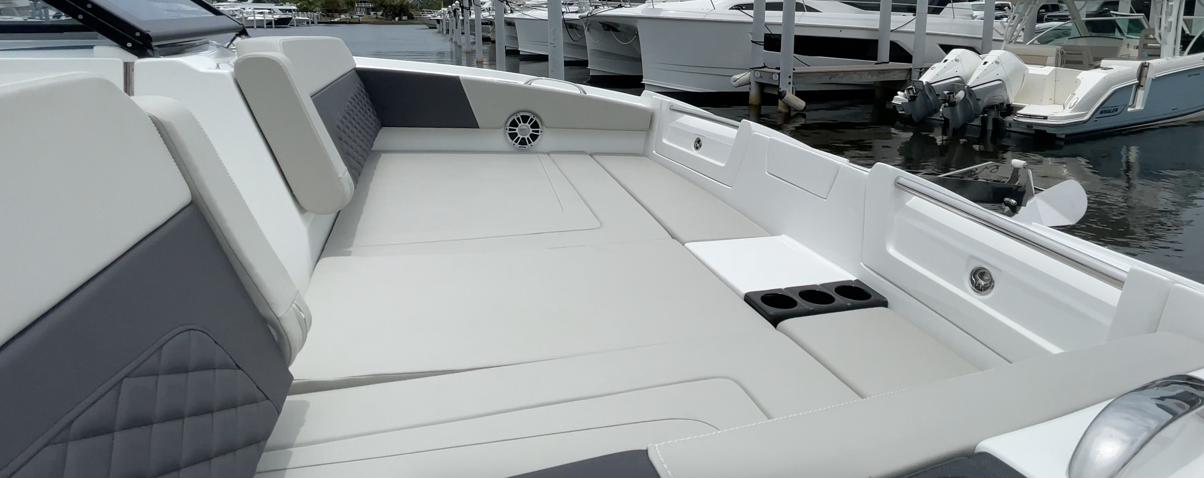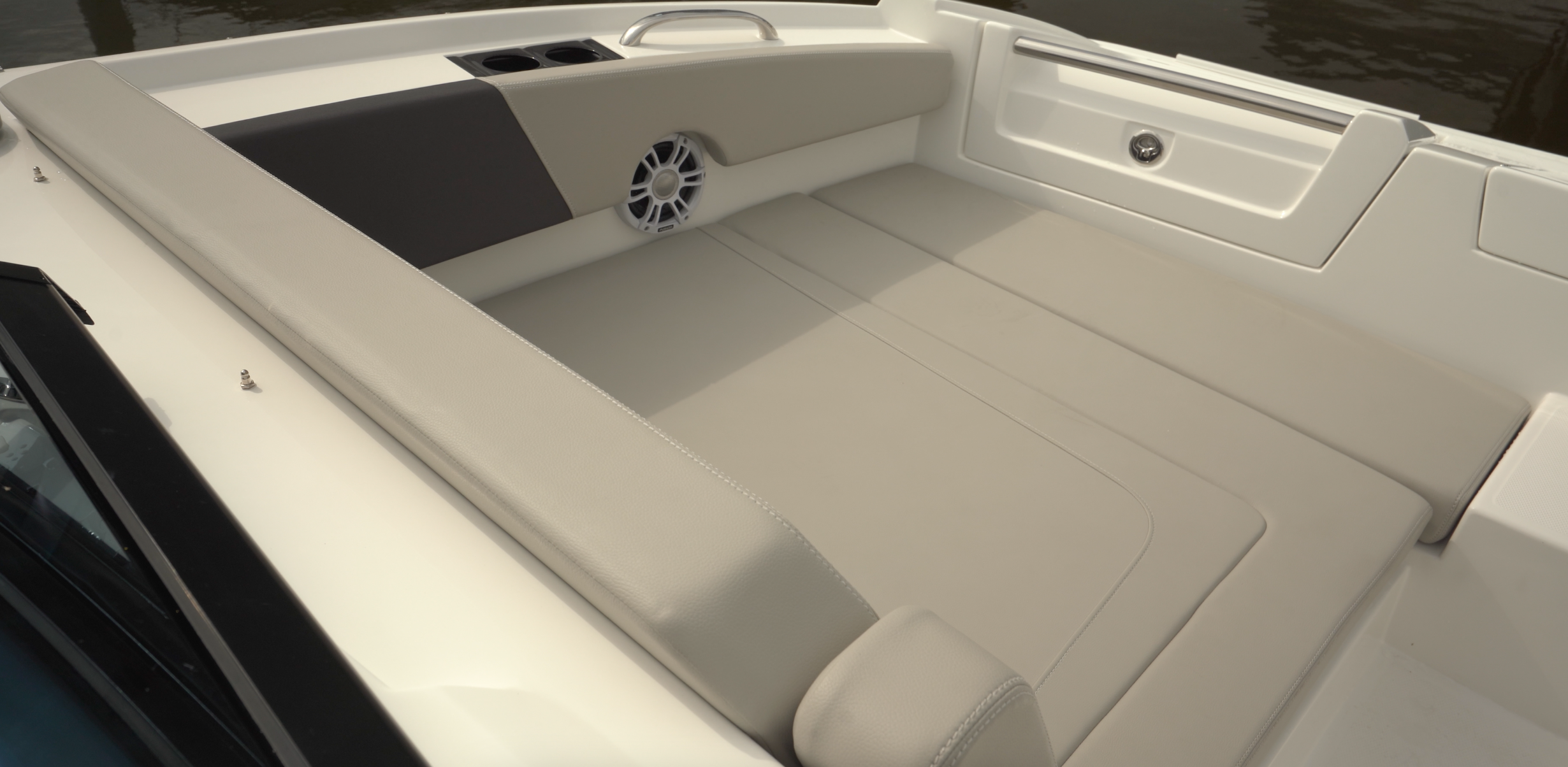 We’ll start in the bow and work our way aft. The 32 Sport Catamaran has an extra-large feel thanks to the boat’s 12’8” (3.85 m) beam. The walk-through is offset to starboard, creating a lounge to port that is 49” (124.6 cm) wide while the starboard side is 29” (73.66 cm). The seats are 13” (33.02 cm) off the deck and have flip-down armrests. A filler cushion for the bow comes standard. We noticed upgraded upholstery treatments in the bow and throughout the boat with two-tone colors, a diamond pattern on the backrest and quality stitching. Even the beverage holders are carbon fiber.