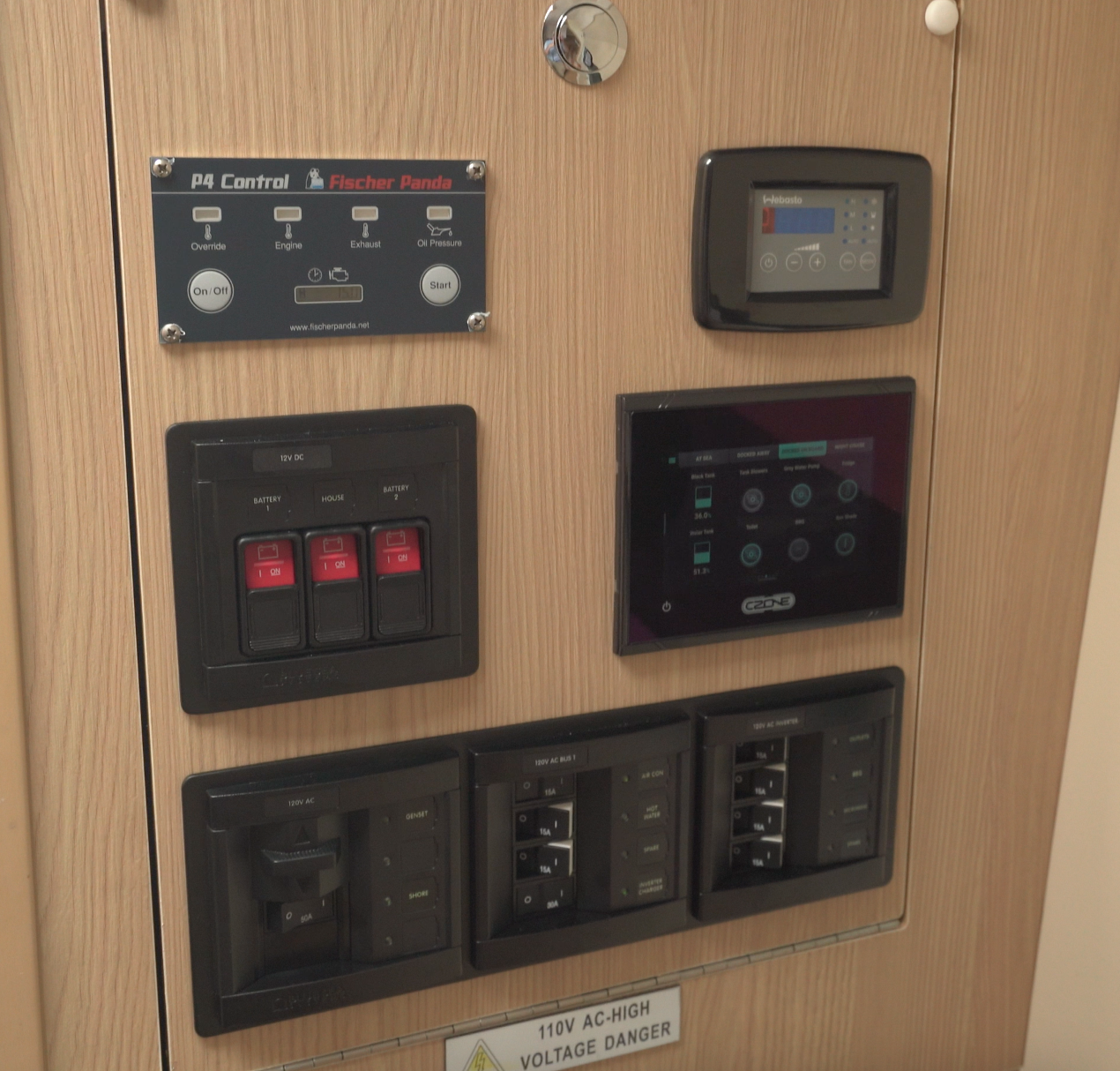 The Cabin. Immediately outboard of the galley is the 32 Power Catamaran’s cabin. Make sure the flip-down footrest for the port companion seat is up before opening the lower door. The cabin has 6’2” (1.87 m) of headroom and the berth measures 79” (200.66 cm) with an average width of 52” (132.08 cm). There are storage shelves to starboard and an opening port in the hullside plus an overhead hatch. The steps for this cabin are offset so enter right-foot first. The battery switches, CZ panel, air conditioning and 110-volt outlet are all within reach from the entryway without having to descend the stairs.