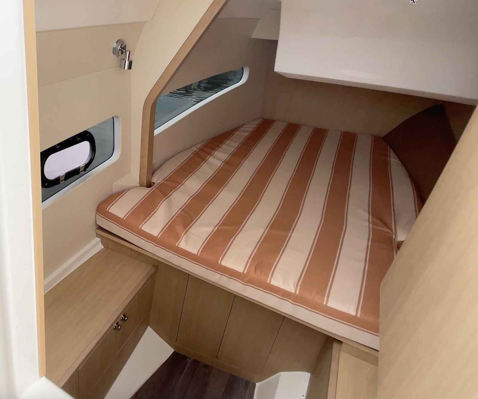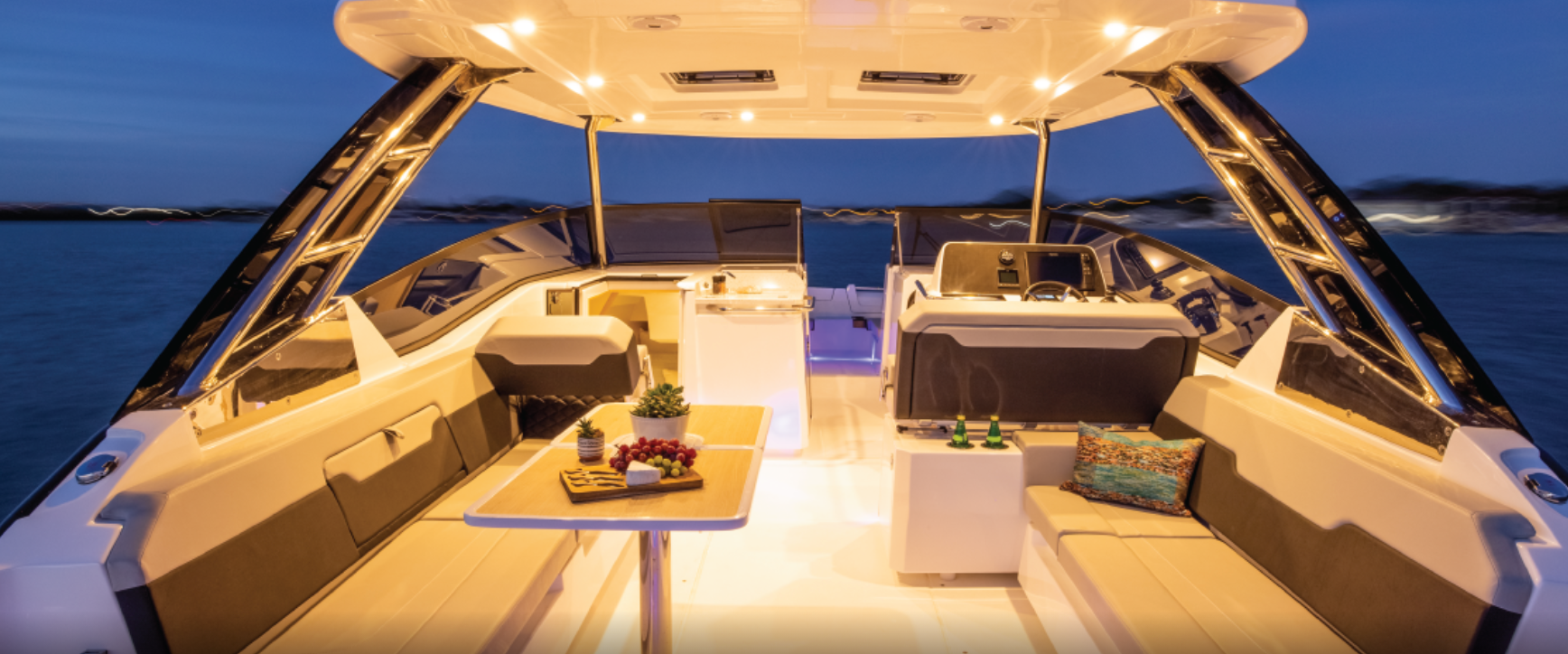 The 32 Sport Catamaran’s cockpit is, in a word, huge for a boat of this size with seating for 12, an expandable table that doubles in size and an insulated cooler beneath the starboard bottom cushion. There’s plentiful storage, including in the port-side backrest. Headroom beneath the standard fiberglass hardtop is 6’8” (2.03 m) and it includes two forward skylights, LED lighting and speakers. An optional SureShade retractable awning that extends over the aft section is an available option.