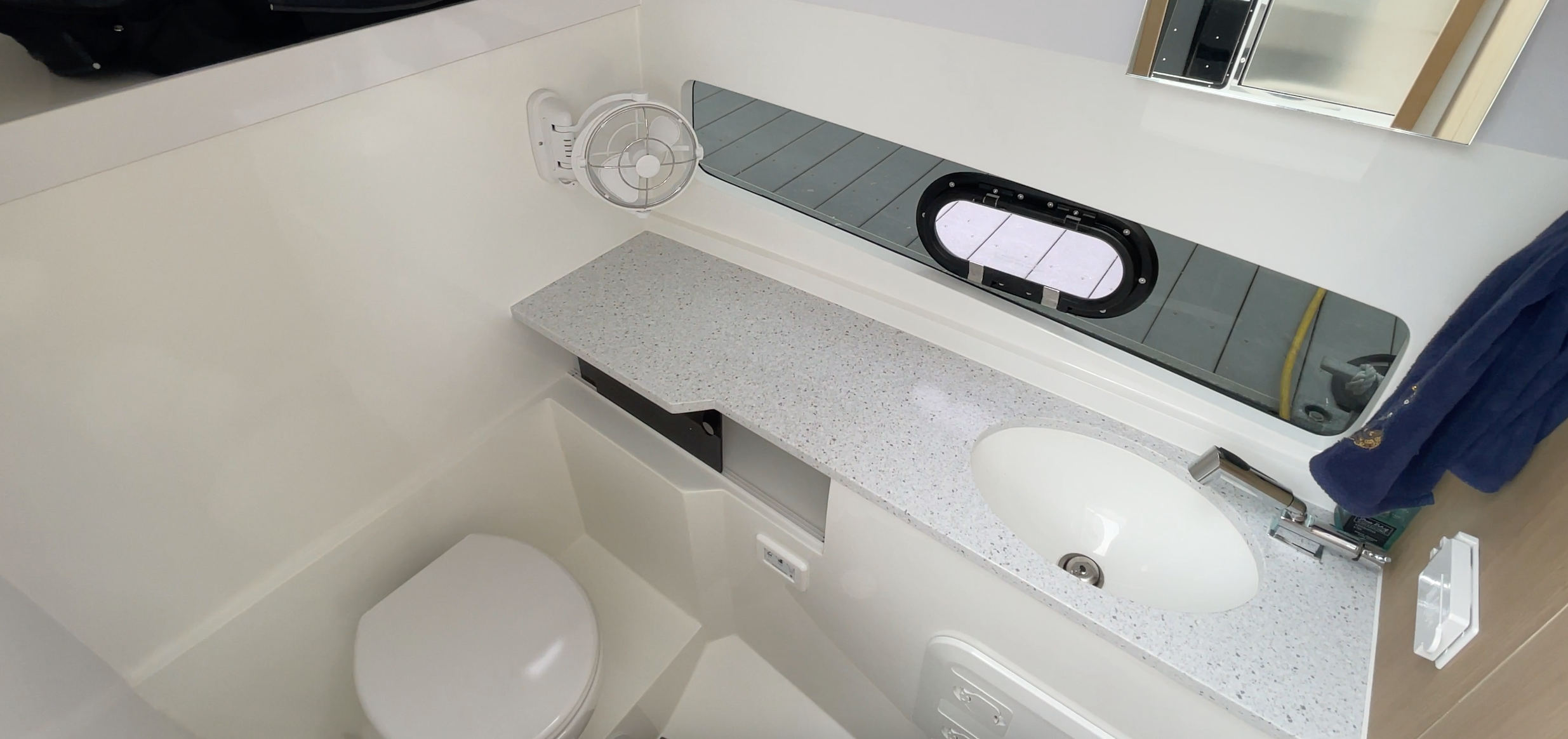 The Head. Opposite the galley to starboard, the head has the same headroom as the cabin. It’s a wet head with a toilet, sink and Corian counters. We’d like to see a clip for securing the pull-up faucet for showering. An air conditioning duct and opening port help rid the area of steam and/or odors.