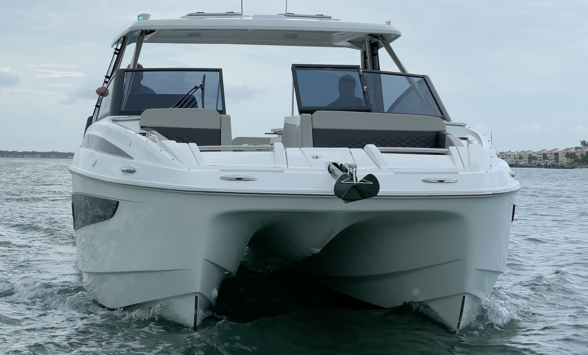 She’s designed with spray rails on the inboard sides of the tunnel and a wave deflector to prevent the sneeze effect. Our test boat had stainless-steel keel guards screwed to the bottom and Aquila tells us it is engineering some hydrofoils for the 32 Sport Catamaran, but they weren’t ready for us to test. Keep an eye out for an updated review with the foils.