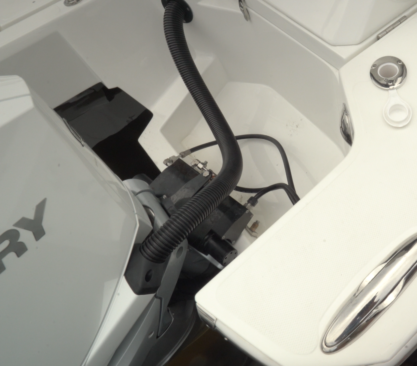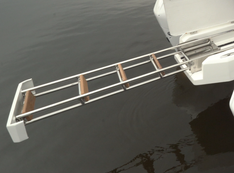 The center passageway extends aft between the twin Mercury outboards and opens to reveal a seriously overbuilt re-boarding ladder. With the ladder deployed, close the hatch and there’s an open walkway from the platform to the cockpit. We noted four optional rod holders on the stern, plus two more 9” (22.86 cm) cleats at the stern but at amidships there were only small fender cleats.