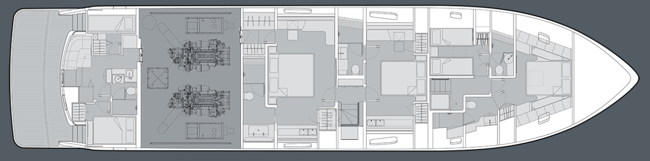 The CLB88 is a four-stateroom/five head yacht that includes a midship, full beam, master stateroom, with a second full-beam master just ahead. This makes for an ideal scenario when there’s shared ownership. All staterooms are furnished to an equal level of luxury.