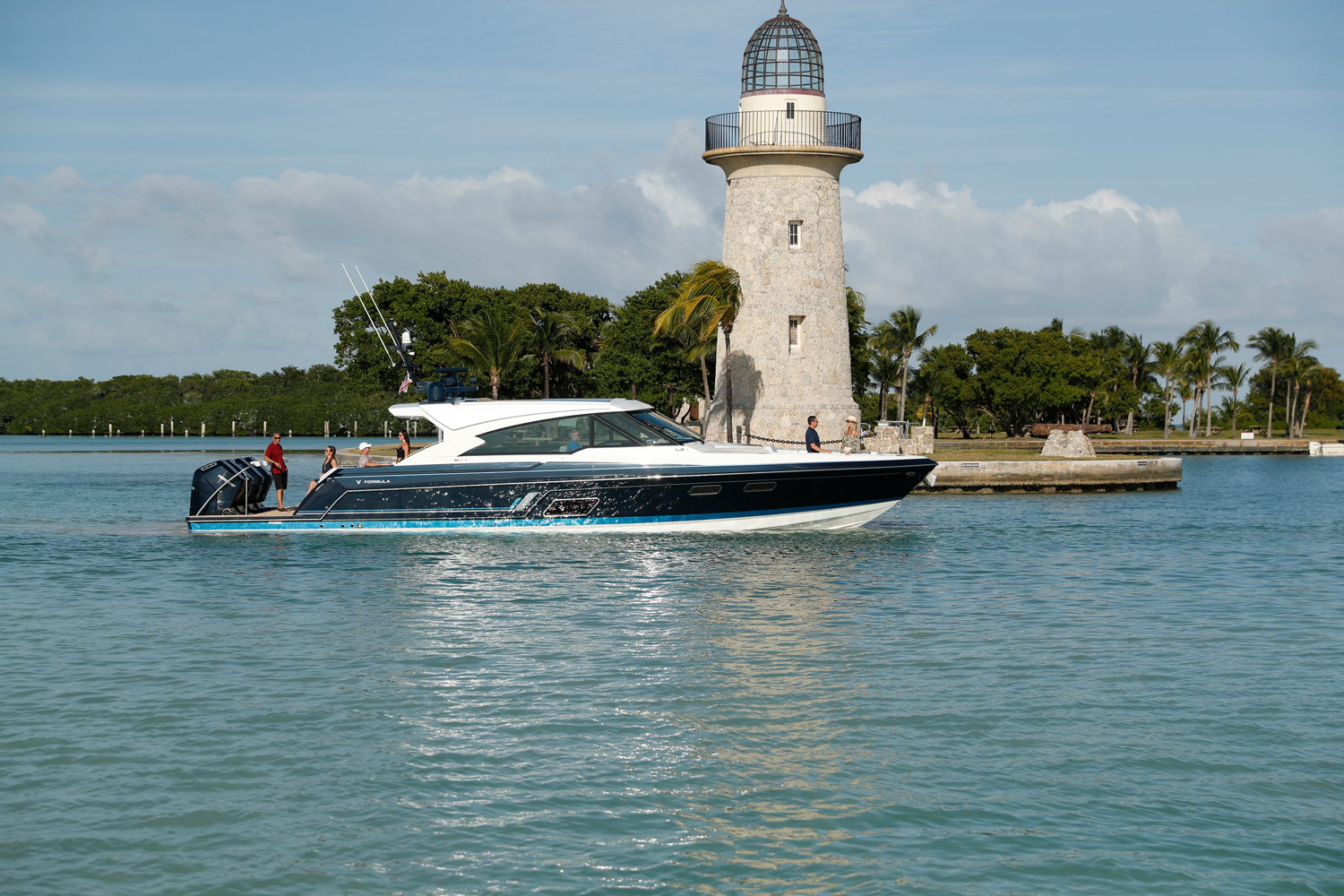 With the four 600-hp Mercury V12 Verados turning 33” (83.82 cm) pitch prop sets, we hit a top speed of 66.4 mph at 6400 rpm. Best cruise came at 5000 rpm where we recorded 50 mph and 117.5 gph, which translated to .4 mph and a range of 249 miles with 10 percent of the boat’s 650-gallon (2,460-liter) fuel capacity. Because of the two-speed transmission in the V12 Verados, when we accelerated from 4000 to 4500 rpm, the fuel burn drops from 114 gph to 106 gph. Equally remarkable is that the 500 SSC stays on plane down to 18.3 mph. She accelerated to 20 mph in 5.8 seconds, planed in 6.6 seconds and hit 30 mph in 10.4 seconds and we passed through 40 in 14.6 seconds.