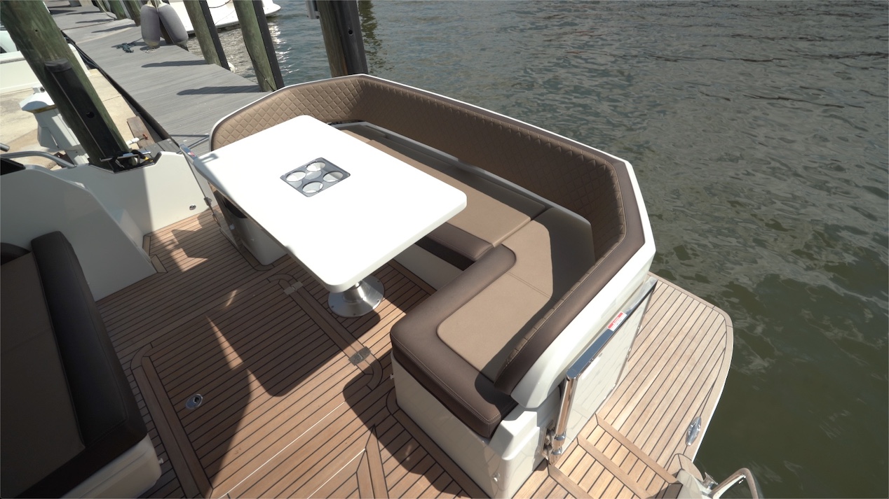 The aft deck social zone starts with a U-shaped seating area behind a solid surface table that measures 24” by 46” (60.96 cm x 116.84 cm). Beverage holders are in the center of the table. It's mounted to a high-low pedestal so we can lower it, add a filler cushion and make this into a sunpad. Ahead is opposing seating. At 52” (132.08 cm), it’s triple wide. This is all under the protection of the overhead 6’7” (2.01 m) off the deck. In the center of the deck, there's a hatch that leads to the deep storage compartment that we saw from the swim platform, and this makes it easy to drop things into the compartment from this main deck.