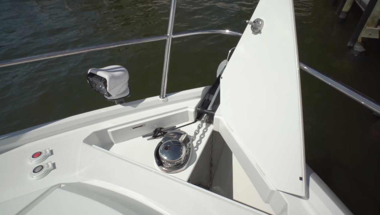 As for the ground tackle, there’s a Quick windlass with an all-chain rode leading to a Delta plow-style anchor. There are foot controls at the bow as well as a hand-held remote control at the helm. Alongside the anchor, there’s a remote-controlled spotlight.