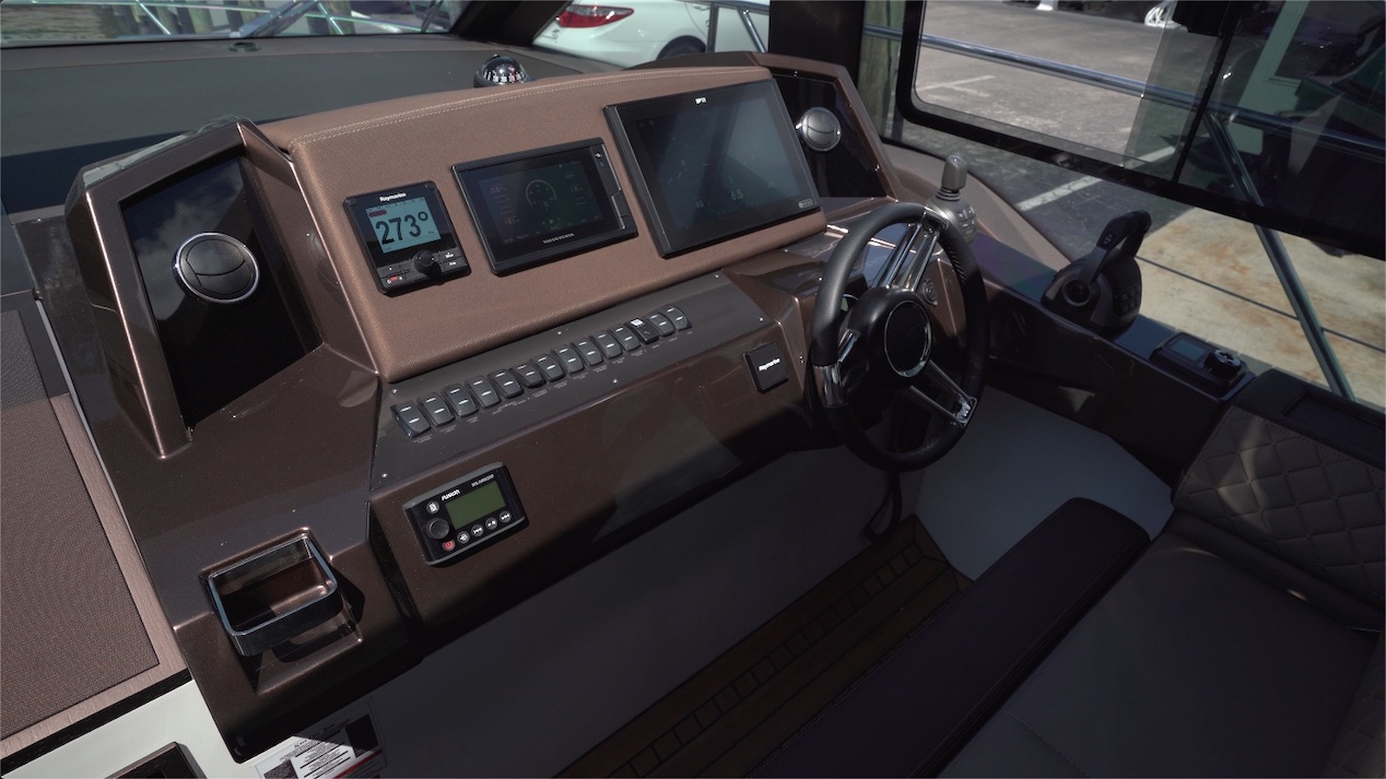 The helm features start with the soft-touch dash. There's a compass center-mounted to the top of the console rather than in line with the wheel. Electronics start with the autopilot, a 7” (17.78 cm) Volvo Penta display and a 12” (30.48 cm) Raymarine display. There are no gauges anywhere because they are all integrated with the Raymarine display. Heat and air conditioning vents are over to the sides, which is always a welcome feature. There’s a row of rocker switches just below and the horn is all the way to the outside, easy to find and easy to access. To the side is the IPS joystick and the digital throttle.