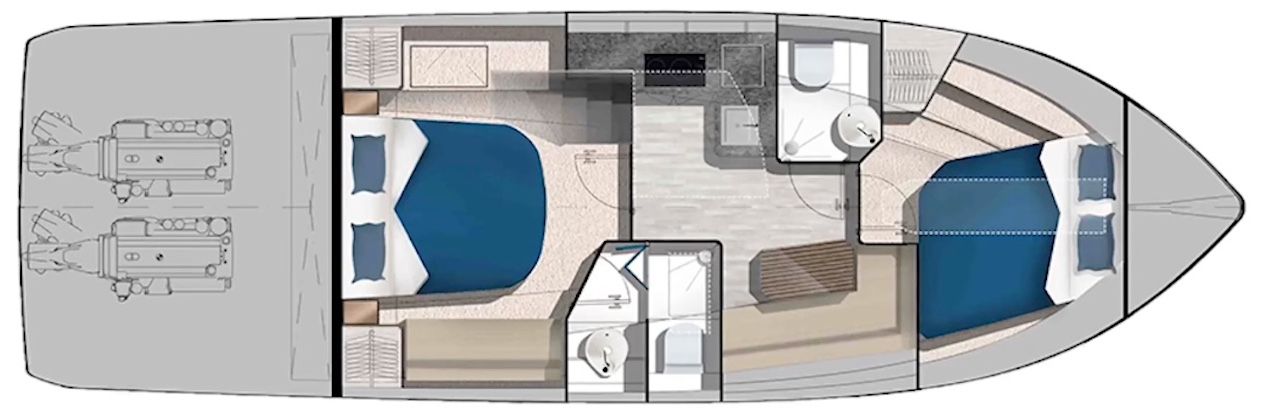 As we move down below, Galeon went with an open atrium concept that pours natural light into the lower deck area from the large single-piece windshield and it makes this area even more spacious.