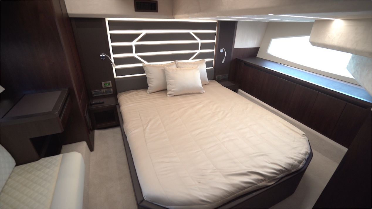 As we enter the full-beam master, make yourself aware that to accommodate the curvature of the hull, there’s also a slight curve to the outer edge of the deck. It’s not pronounced, but just something to be aware of. So, your first inclination might be to step on that angle and your foot will slide down to the flat portion. The overhead has an irregular shape to accommodate all of the components of the main deck above, but there’s standing headroom of over 6’ (1.83 m) to the starboard side pocket of the overhead. The most notable measurements however might be the average 5’3” (1.57 m) from the deck, which leaves 3’3” (.99 m) from the berth to the overhead. The berth is center-mounted and measures 76” by 63” (193.04 cm x 160.02 cm). There’s a beautiful headboard and it’s nicely backlit.