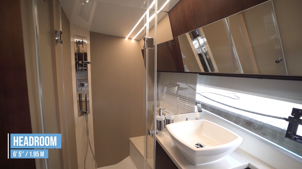 Inside, there’s a large amount of natural light coming through 360-degrees of glass. The overhead is 6’8” (2.03 m) off the deck, which further adds to the open feel of the 425. If there were any misgivings about this boat feeling like a smaller sister of the 485, this should put them to rest.