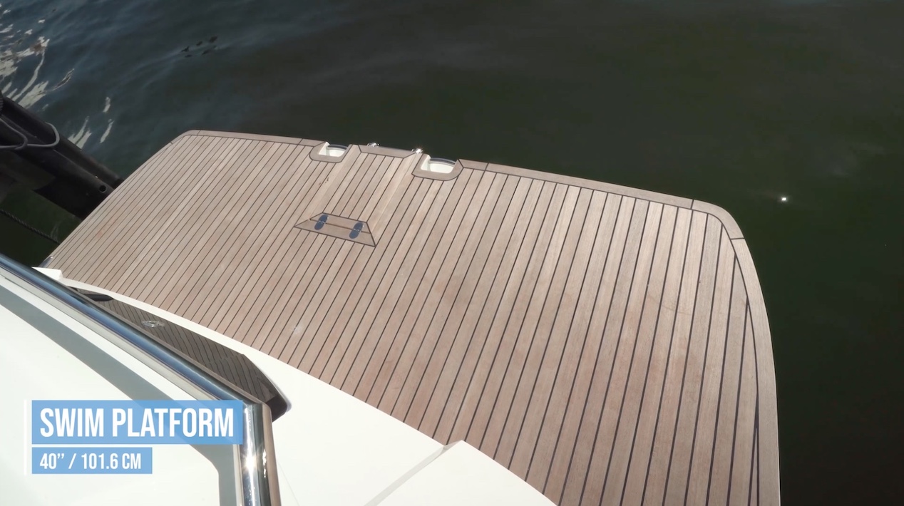 The swim platform comes out 40” (101.60 cm) from the transom. In the center is a three-step reboarding ladder. A strap runs from the hatch and then under the ladder to lift it and make it easier to deploy. It also has teak treads and grab handles are to both sides.