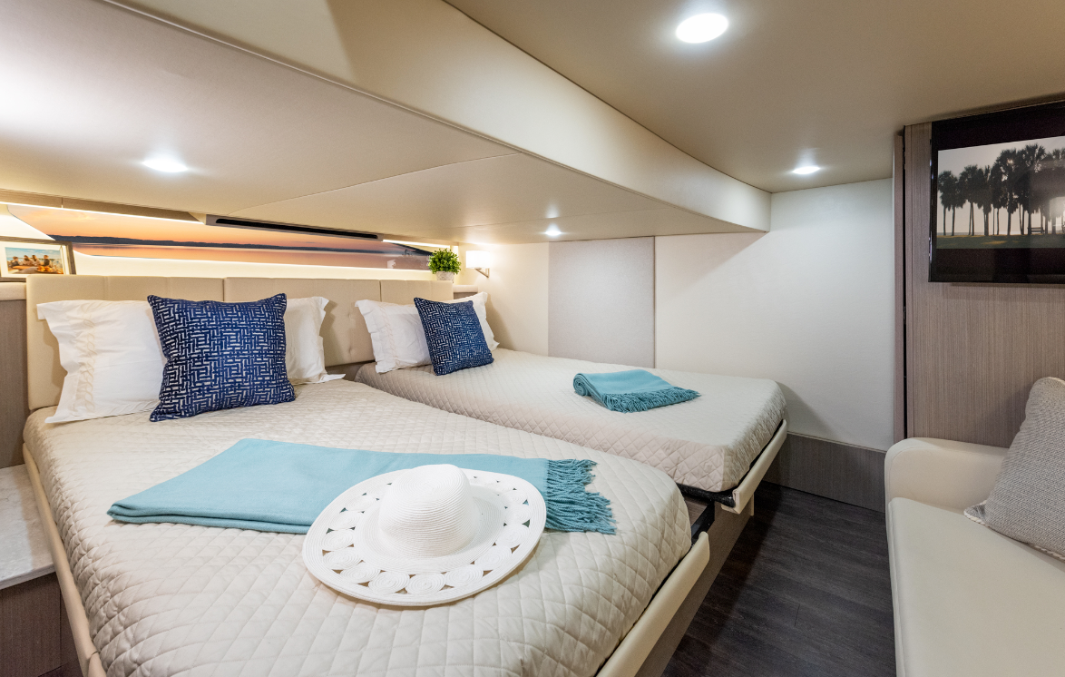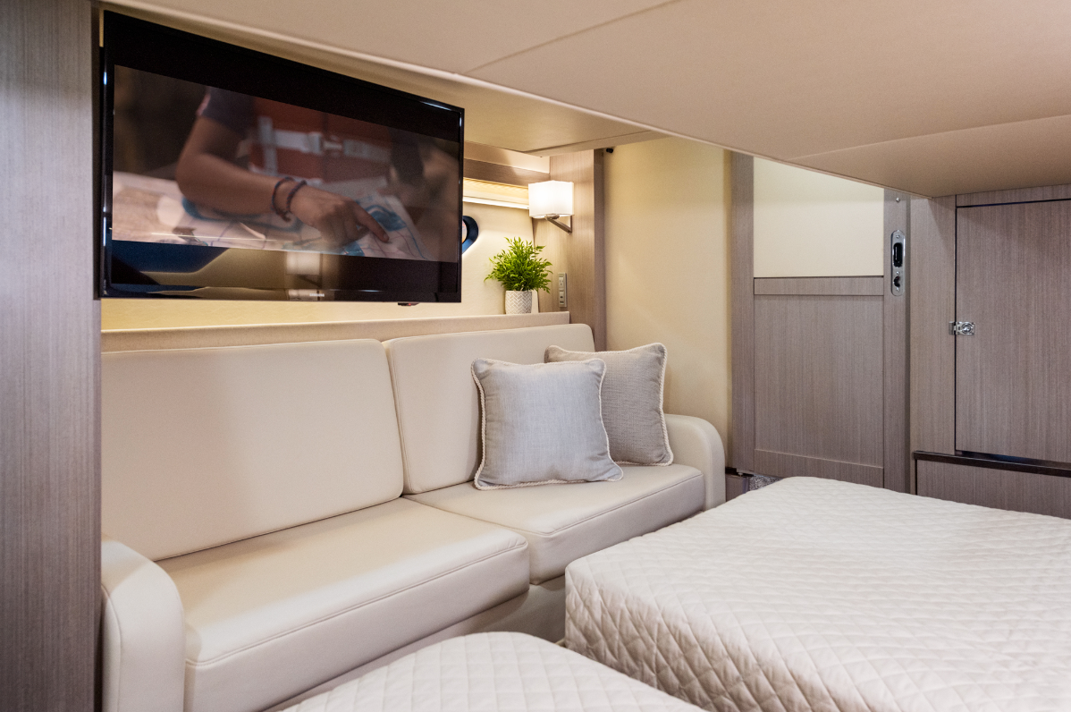 The Aft Cabin. The aft cabin has a true king-sized berth, 78” x 78” (198.2 cm), that can be split, plus a 66” (167.64 cm) long sofa at the foot and a 32” (81.28 cm) TV. There are long hullside windows on each side. Headroom for this cabin is shorter at 4’7” (1.4 m) maximum and then 2’6” (.76 m) over the berth, so it might serve kids better with the two sleeping areas and minimal headroom.
