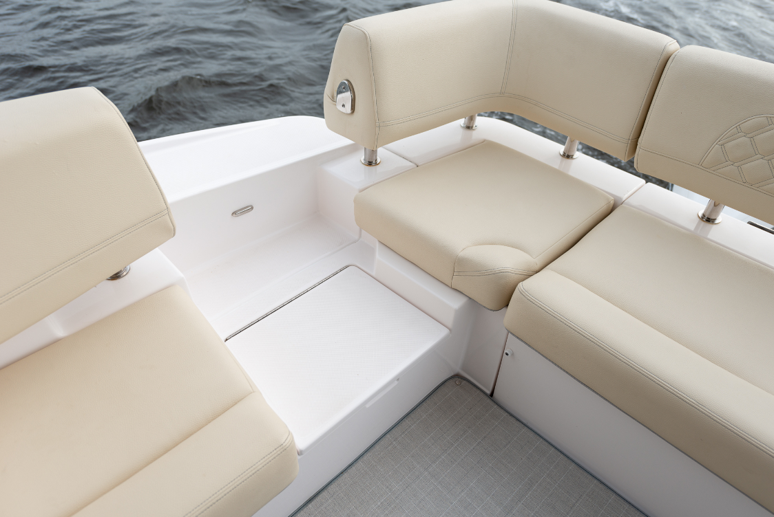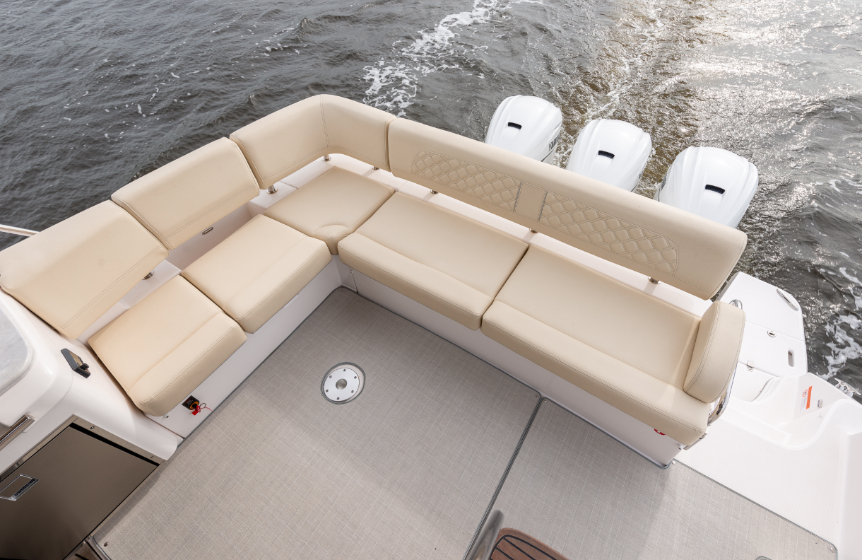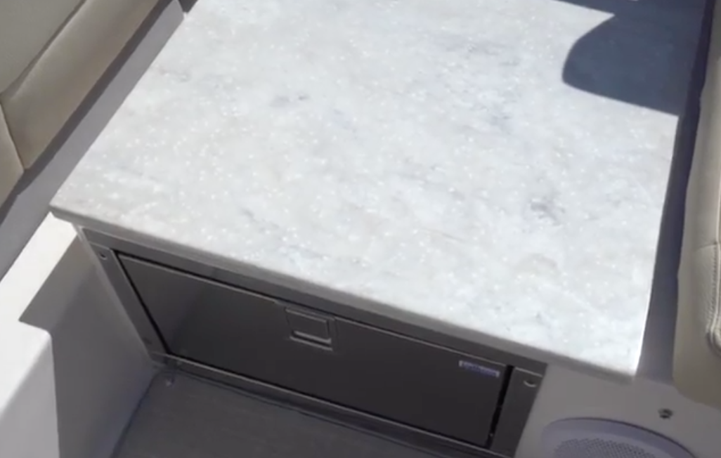The Cockpit. Back down in the cockpit, there’s a passage to the swim platform. For entertaining, there’s an L-shaped seat that wraps around to starboard. At the forward end is a galley that includes an electric grill under a hatch and has a refrigerator in the base. A pedestal table can be installed on the deck. The extended flying bridge shades the area and has 6’5” (1.95 m) of headroom underneath. To facilitate boarding from the starboard side, remove the bottom cushion and backrest. The walkway doubles as a hatch that opens to access battery switches.