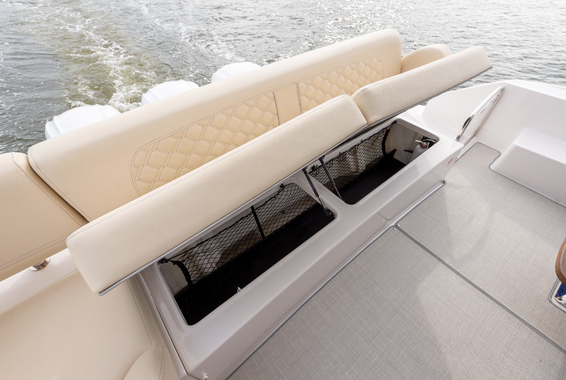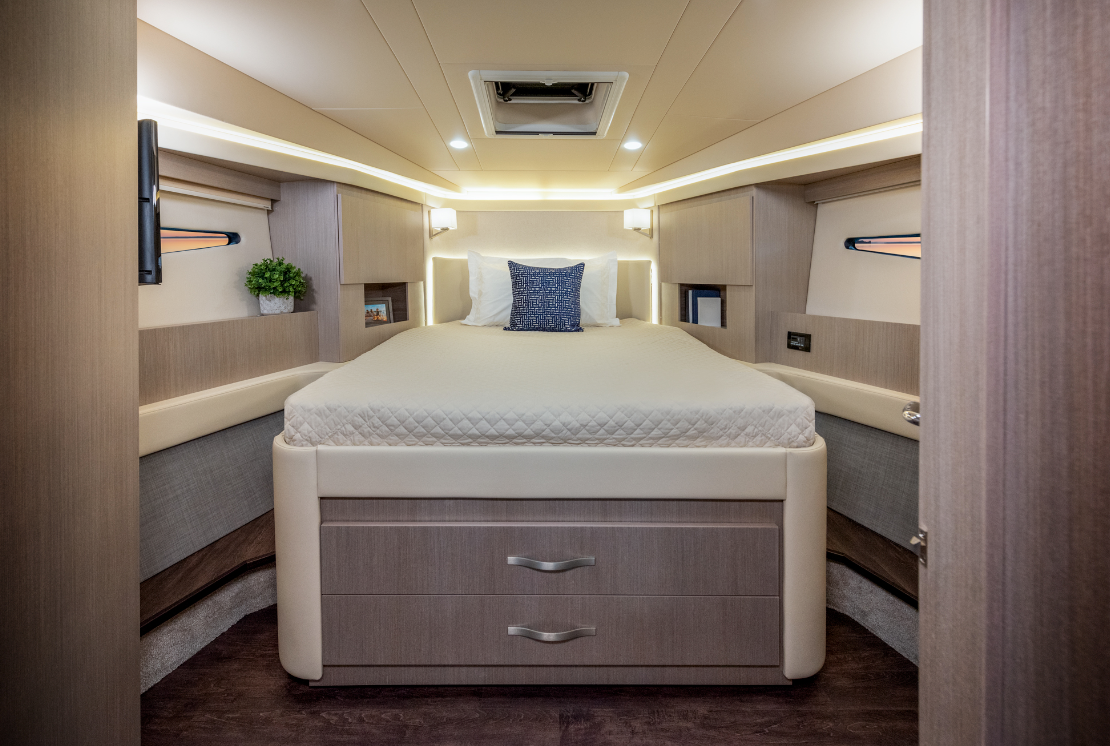 To starboard, there’s a 50-amp shorepower cord on an electric reel, plus the television antenna connection and a city-water inlet. There’s a pull-out freshwater shower just above. Further up on the stern are fills for gas and diesel because our test boat had the optional diesel generator. A hatch opens a large trunk locker. Push a button in the cockpit and the entire aft seat structure lifts on a power lift to provide access to the lazarette. Inside, the area has 42” (106.68 cm) of overhead clearance plus plenty of dedicated shelving, drawers, and overall space. There’s a day hatch and ladder for access from the cockpit. To port, the fuel-water separators with individual gas shutoffs are in reach and we could get to the batteries and generator.