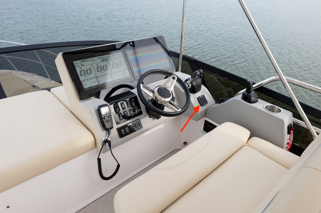 Flying Bridge Helm. The upper helm has a glass-dash configuration with optional twin 16” (40.64 cm) Garmin multifunction displays. A single 22” (55.88 cm) unit is standard. The entire panel can be backlit for nighttime use. Accessory switches are to the left of the tilt steering wheel with the Yamaha ignition switches just below, and outboard of these is the VHF radio. Immediately to the right of the wheel are connectivity ports with a storage tray just ahead. To the right are the digital controls with the trim tab panel aft. Abaft the tabs is the thruster stick, and aft of this is the Yamaha Helm Master joystick.