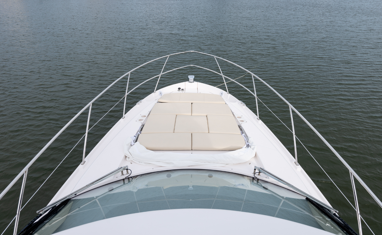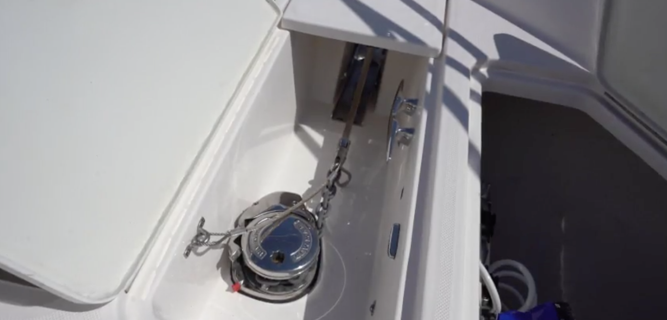 The Bow. On the foredeck, the 42 FXO has a sunpad that’s 81” (205.74 cm) long and 63” (160.02 cm) wide. Backrests in the forward section can be set in three different positions while the aft ones can be raised in two positions. There are beverage holders alongside, and instead of a fixed remote control for the stereo, Regal provides two Bluetooth units that can be used anywhere on the boat. Our test model had the optional cabana sunshade for the area. Forward, the windlass is beneath a centrally-positioned hatch in the deck and the anchor passes through the stem. There’s a 10” (25.4 cm) cleat for securing the rode and a hatch to starboard has a battery switch for the windlass, plus an emergency handle and a washdown. To port is a locker that has line hangers and space for fenders.
