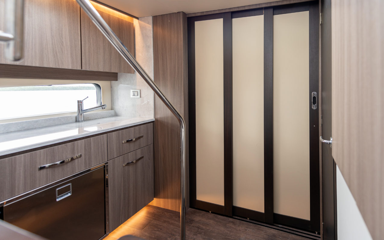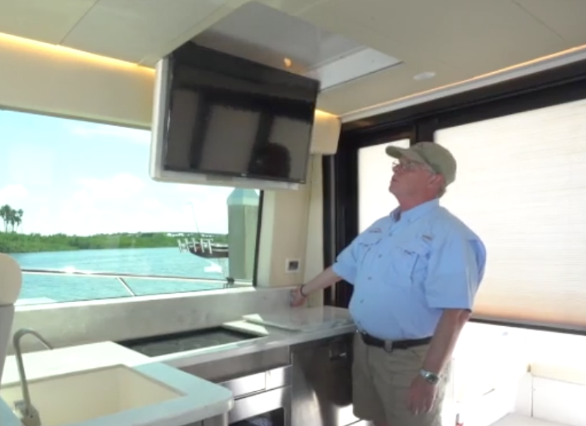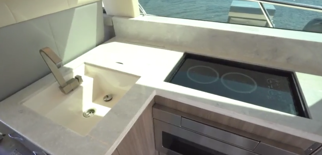 The Salon. The transition into the 42 FXO’s salon couldn’t be easier thanks to sliding aluminum-framed glass doors that fully open to create an opening that’s 5’11” (1.8 m) wide. To starboard, the galley has a Corian countertop with removable sections that uncover the sink and double-burner electric stove. Regal provides dedicated racks for the covers so they won’t get lost or slide around. In the forward port corner, another hinged hatch is above the wastebasket. There’s also a convection-microwave oven and refrigerated drawers, plus a plethora of storage options. Overhead, a 32” (81.28 cm) TV folds down quickly so folks on the settee to port can watch it. The settee is on an elevated platform that’s 9” (22.86 cm) off the deck and is outboard of a 55” by 22” (139.7 cm x 55.88 cm) table on a fixed base.