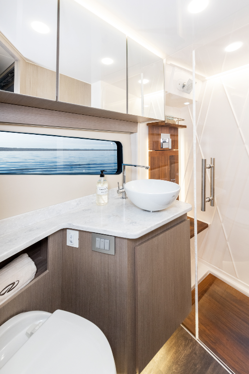 The Head. The 42 FXO has a head with entry from the atrium area or a door in the forward cabin. Inside, it has Corian counters, a large window, a vessel sink, a toilet and a separate shower.