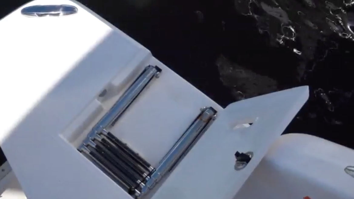 The Stern. The swim platform and outboard mounting bracket are built into the 42 FXO’s bottom, creating a single strong structure. In addition to supporting the outboards, this creates more aft buoyancy, which results in less bow rise when coming on plane. Swim platforms that are 3’ (.91 m) long extend aft past the engines on each side and the port side has a four-step reboarding ladder in a locker. For maintaining the engines, there’s an 18” (45.72 cm) deep full-beam walkway between them and the transom.