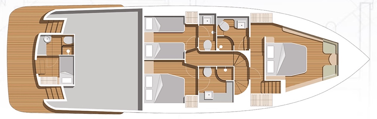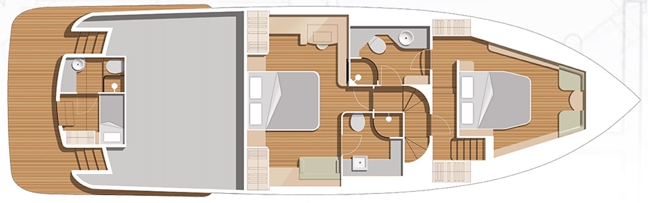 Now let’s head below. In the case of our test boat, we had the optional three-cabin layout. The companionway is to the starboard side of the helm station and it has been given a redesign for this model year. Previous versions just seemed a little steep and narrow, but that is certainly not the case here. Instead, there’s a distinct comfort level when negotiating these stairs. They lead us through a door to a balcony overlooking the master stateroom.