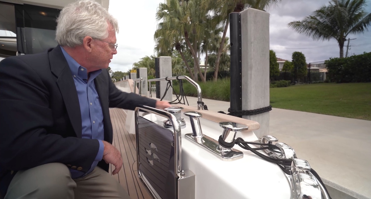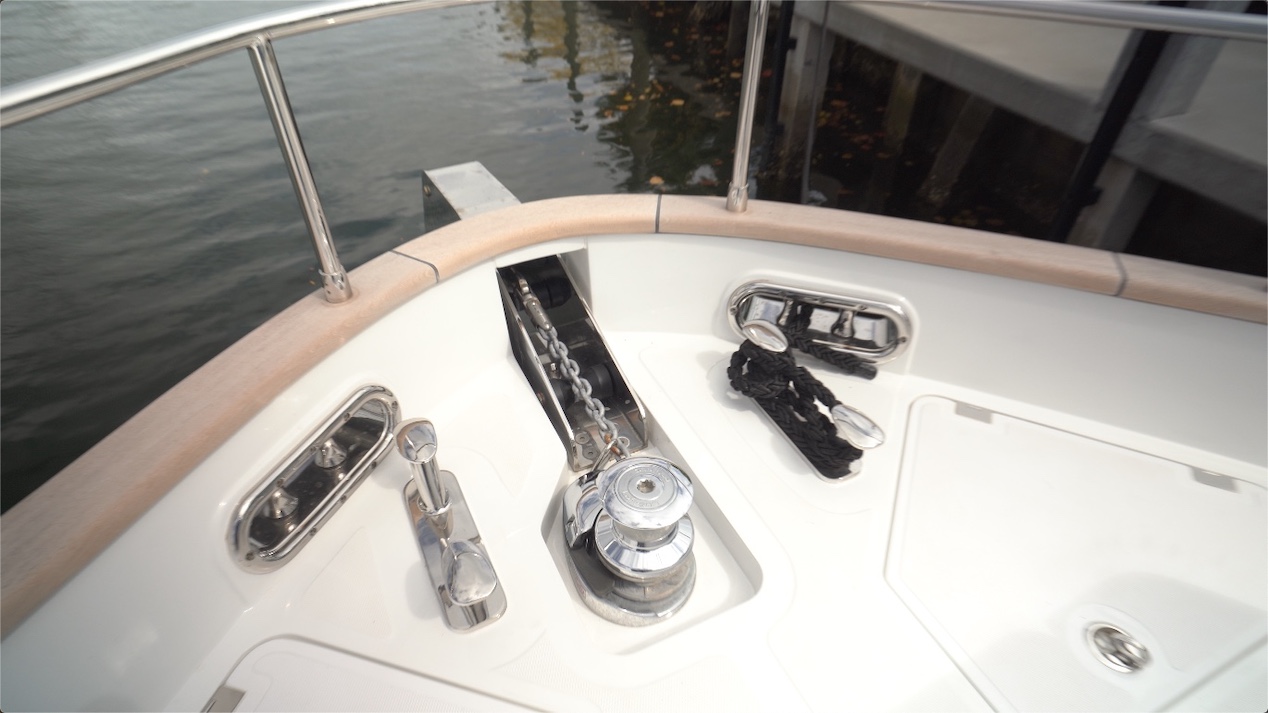 In the quarters, heavy-duty rollers are mounted to big stainless-steel chafing gear. There’s a big bollard just behind and an optional warping winch. The excess line is stored in a compartment just behind and it’s nice to see that the controls for the winch are up high rather than on the deck. Of course, this is all repeated to the opposite side.