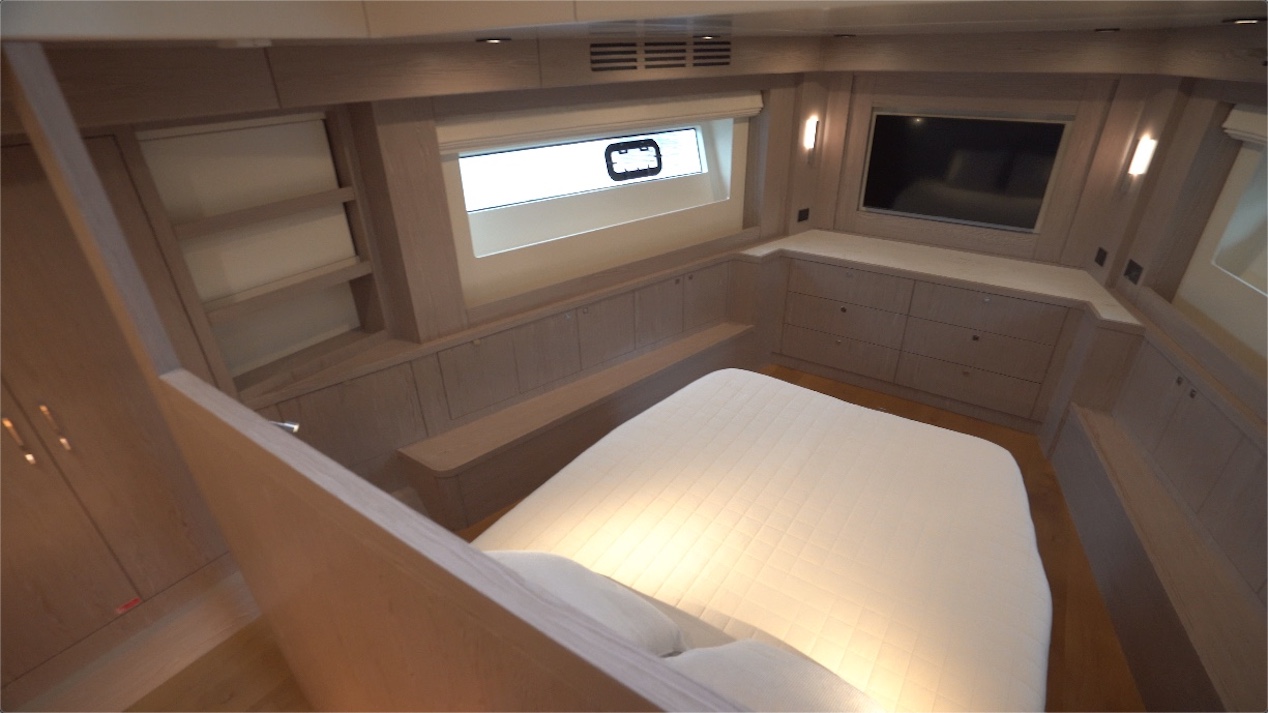 The VIP stateroom is to starboard and it has a berth that measures 62” x 75” (157.48 cm x 190.50 cm) up against the starboard bulkhead. Overhead height is the standard 6’5” (1.98 m) that we’re seeing throughout the yacht. There's a hullside window with a manually operating shade — or electrical is available as an option.