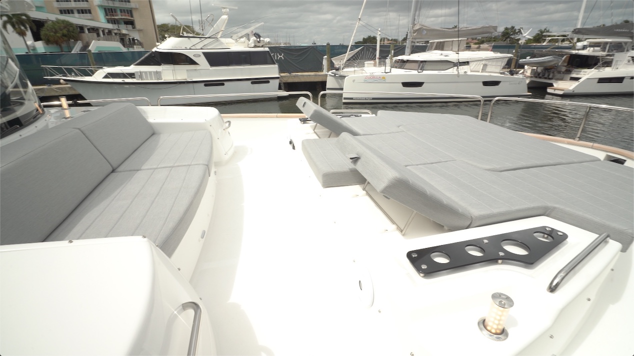 The bow entertainment zone starts with a forward-facing seat. There’s an option of having a table just ahead of the seat. Further ahead, there's a triple-wide lounger. The seatbacks lift into the chaise lounge position at two separate heights. There’s also a large storage compartment forward and to the center. There are pop-up LED lights surrounding the lounging areas, adding to the allure after the sun drops below the horizon.