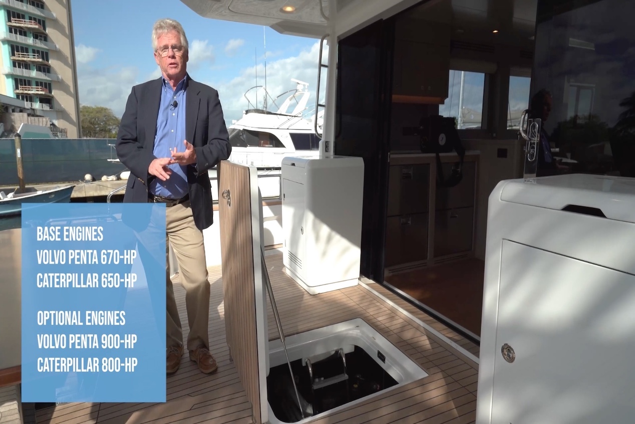 The engine room is accessed from the hatch in the aft deck. Choose from either the Volvo Penta 670s or Caterpillar 650s for base power. Options include the Volvo 900-hp or CAT 800-hp. The boat we were on was powered with the Volvo 670s.