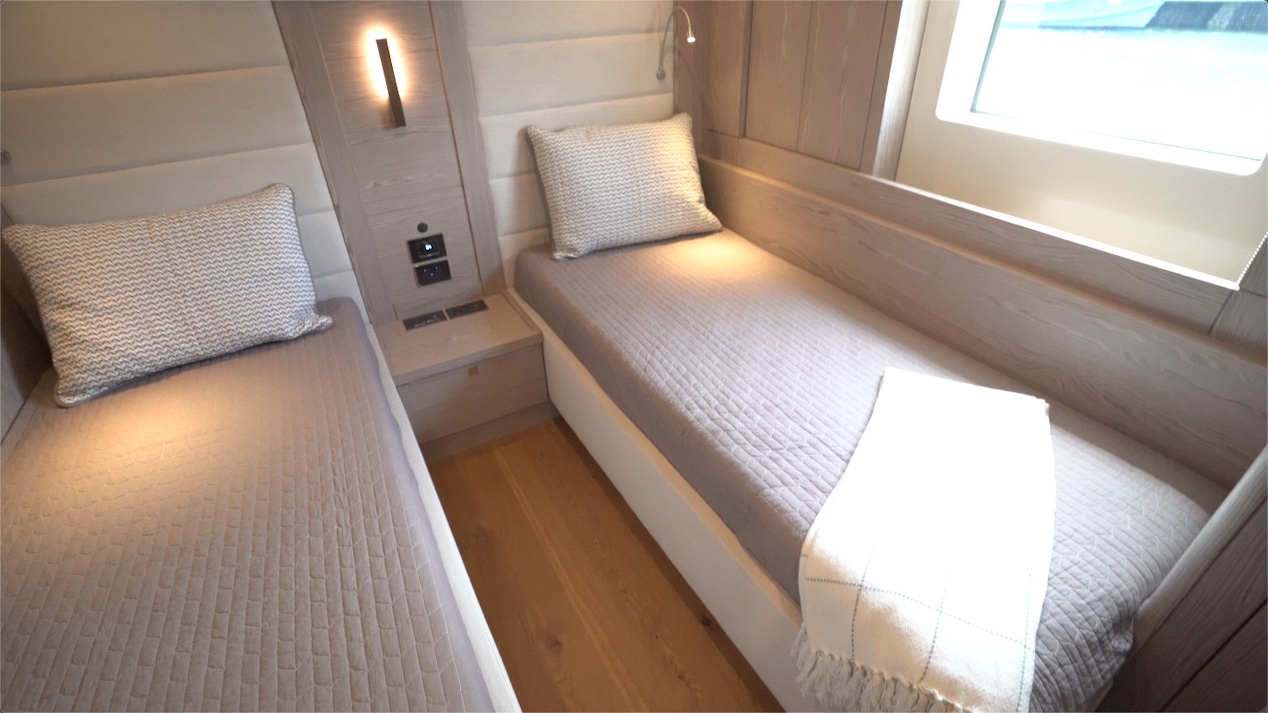 Now for the guest stateroom, this one has twin berths and plenty of options are available. We can put a filler cushion in the middle, we can get an option to slide the berths together or have a queen size berth as we saw in the previous stateroom. This one also has a hullside window and a wet head just in front.