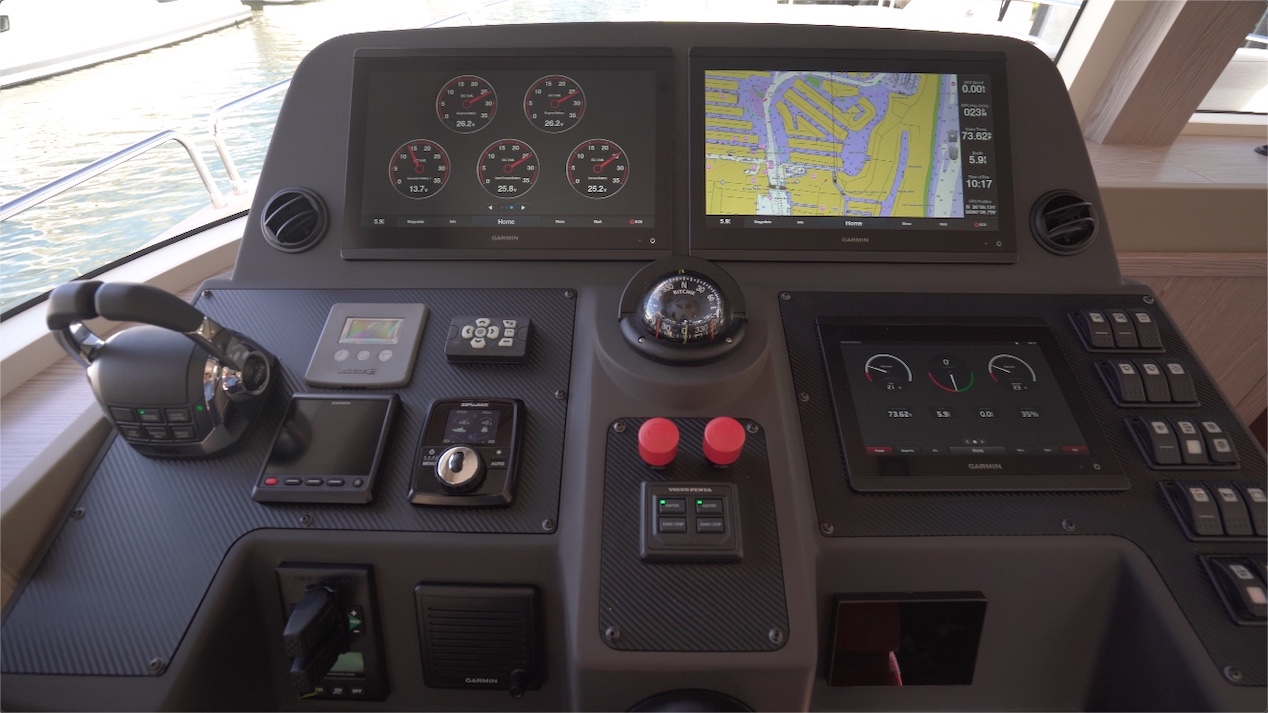 The helm is port-side mounted and it starts with two large displays on the upper panel. Air conditioning and heating vents are on the sides and I like seeing that. The digital controls are over on the left of the console. There’s a Garmin autopilot and a ZipWake controller. The compass is right in line with the wheel.