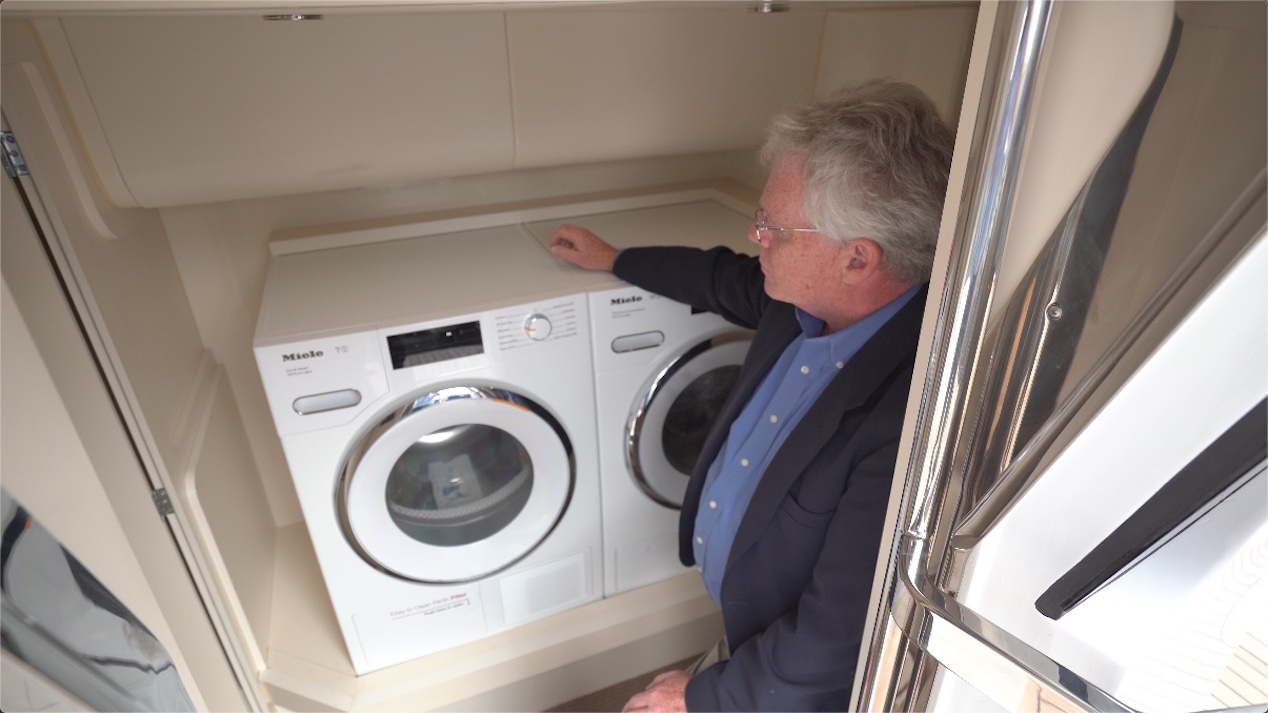 The platform is accessed from stairs to port and starboard. In the transom, there’s a door that leads to what could be crew quarters, but this owner chose to utilize this space for a laundry room. It includes a Miele washer and dryer right next to each other at the base of the entry steps. If we make this the crew quarters, there would be a berth in this location. There’s a wet head over to the port-hand side.