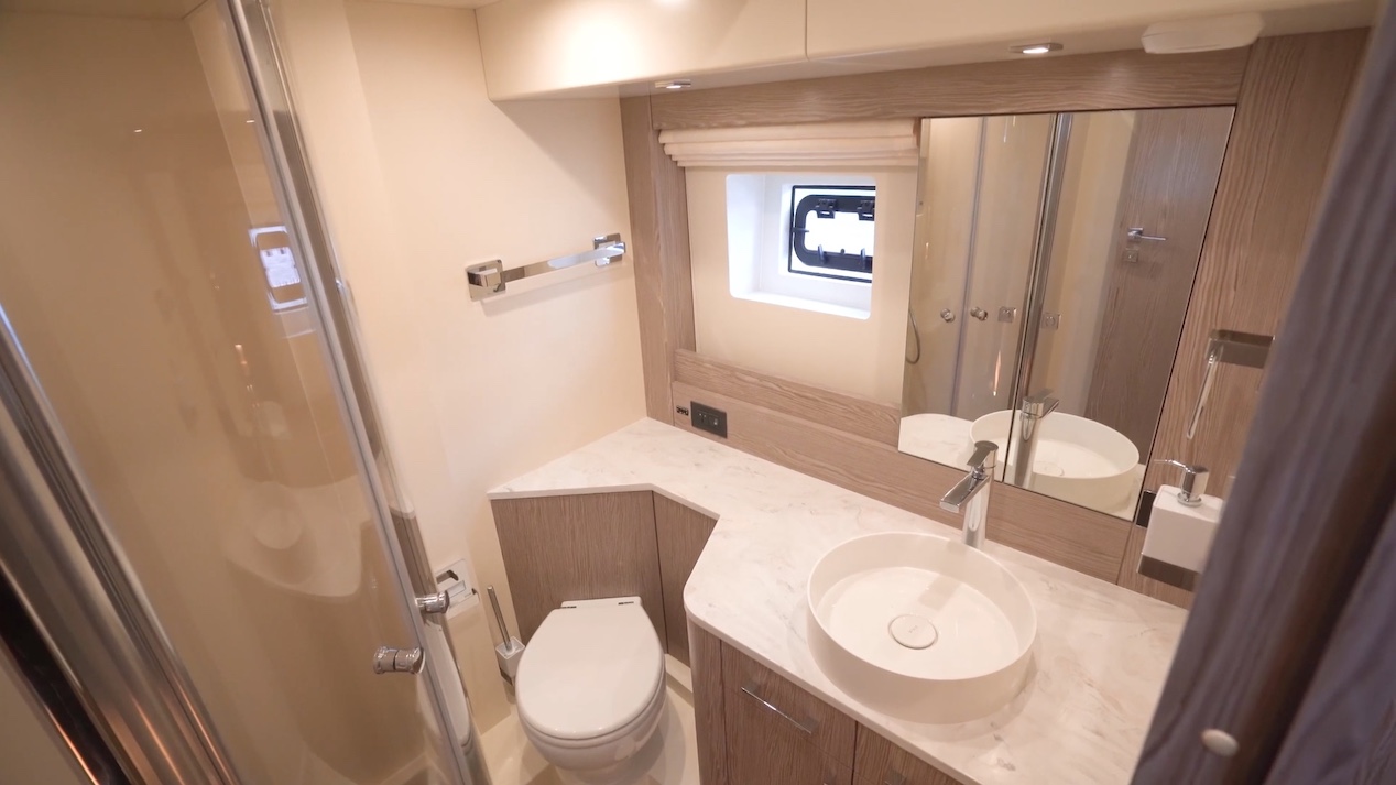 There’s storage just behind, underneath the berth and in a hanging locker with a mirror on a swivel behind the door. The private ensuite has a walk-in shower, a vessel sink, more Corian counters and an opening portlight.