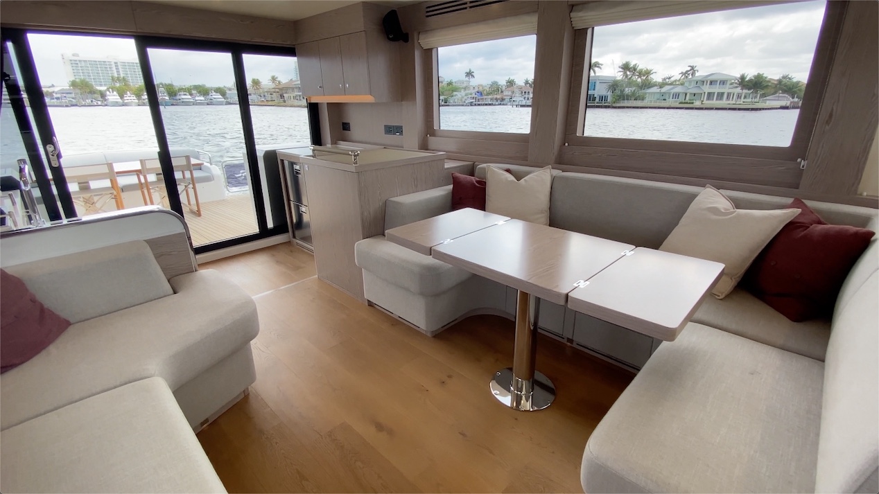 Moving into the salon, it's just a step up that reduces the ceiling height to 6’6” (1.98 m), so “reduces” is a very subjective word. There’s outstanding visibility all the way around through large windows and of course the huge forward windshields. There are manual blinds, but electric blinds are an available option. Seating starts with a U-shaped settee over on the port-hand side wrapping around an expandable pedestal table.