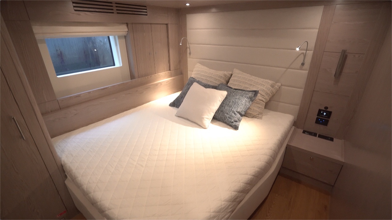 There’s a set of stairs immediately to starboard that lead right up to the bow. From this elevated vantage point, we have a good view of the windows to both sides with opening portlights. There’s plenty of storage going all the way around the stateroom. There’s a chest of drawers up forward with shelf space on top. There’s also a 43” (109.22 cm) TV that's recessed into the forward bulkhead. The 74” x 60” (187.96 cm x 152.4 cm) island berth is center-mounted on the keel with nightstands to both sides. Overhead clearance is 6’5” (1.98 m).