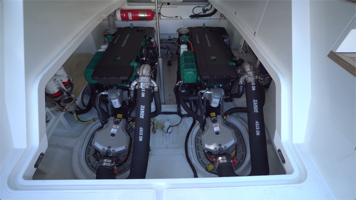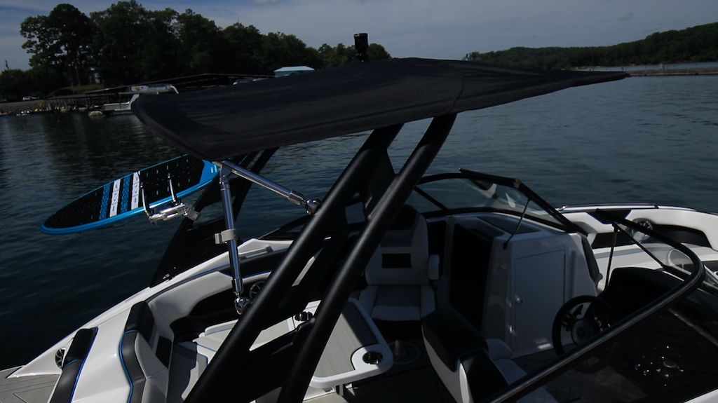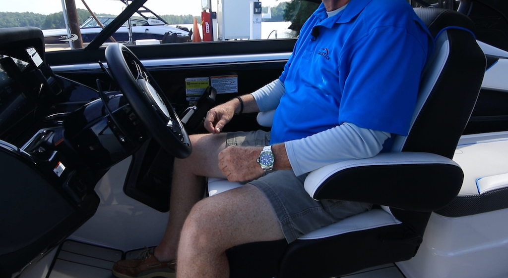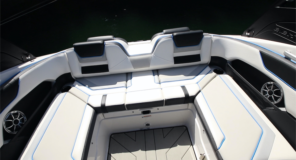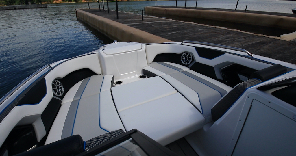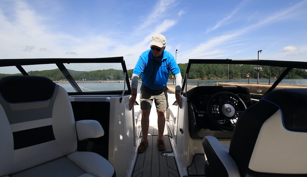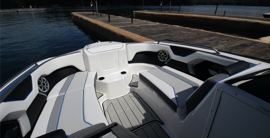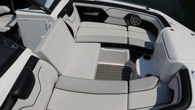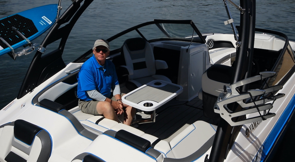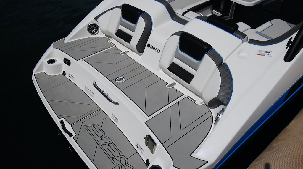 One of our favorite features of Yamaha boats is the aft swim platform patio. With a 19” (48.26 cm) deck up top and a 16” (40.64 cm) deck below there is plenty of space to lounge or get staged for watersports/towing. There is a place to mount the pedestal table on the starboard side and the stereo controls on the port.