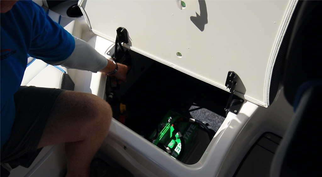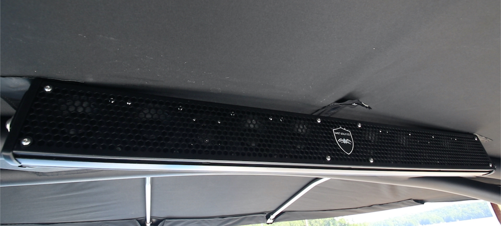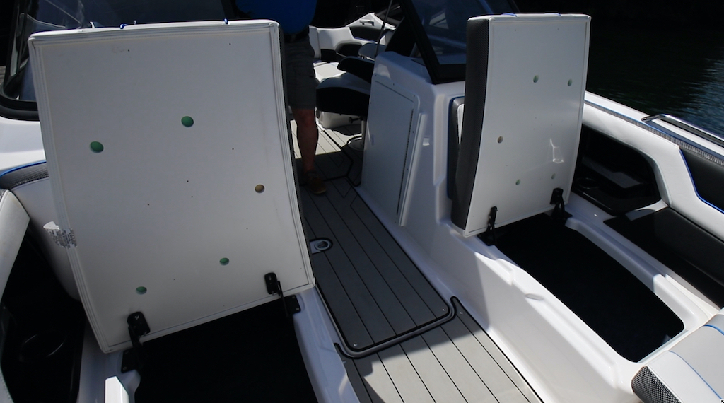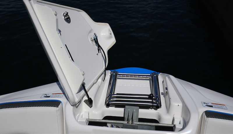 The bow cushions can be arranged in multiple configurations from a sun pad to a general seating area. Fully forward, there are steps going up the bow hatch so we can help facilitate bow in boarding. There is a beach reboarding ladder in the anchor locker. The two seats are 25” (63.50 cm) apart and the padded bolsters come up 13” (33.02 cm). There are two beverage holders on the bow step, two more in the gunwales aft and two speakers facing inward.
