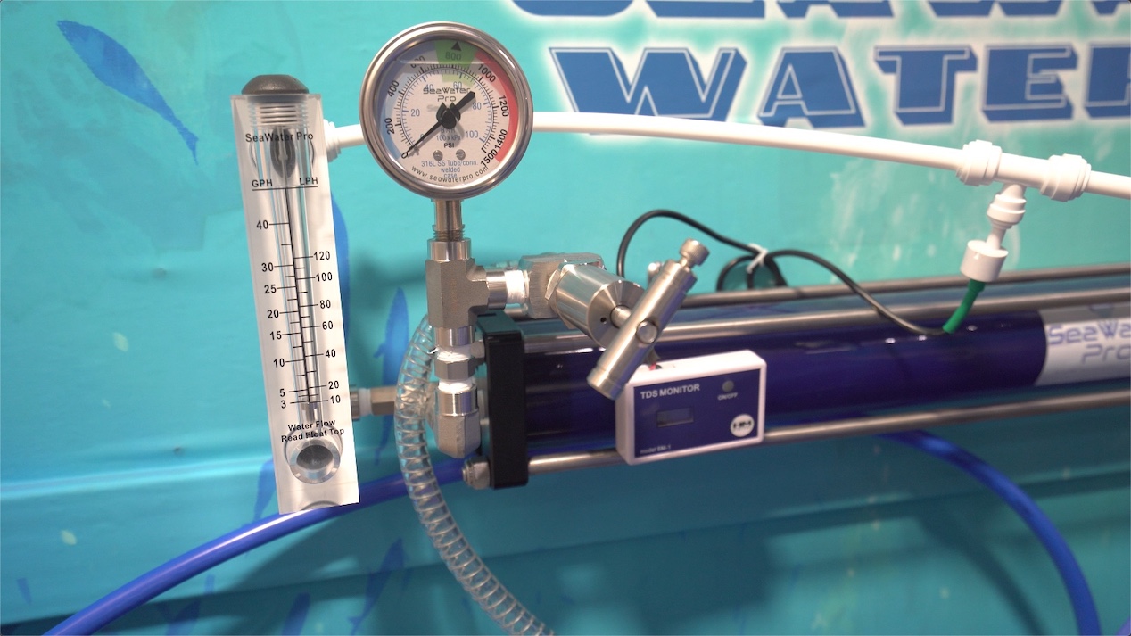Now here’s a very important component that we see missing even on some of the larger models. If air gets into the system, say from jumping over a wave, that air bubble will get transferred through the hoses and into the membranes at high pressure. Without a pressure regulator to absorb that subsequent “hammer effect” of the water shooting in behind that air pocket, the cheap white membrane housing will burst.