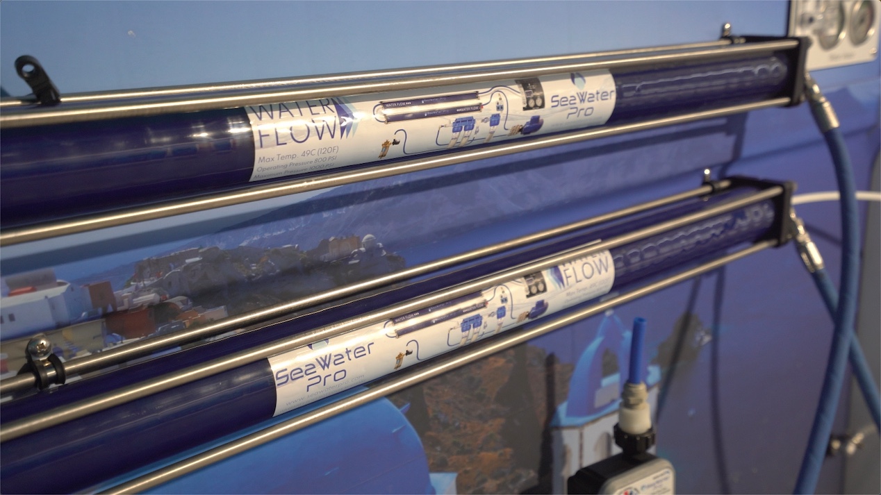 This is the heart of the watermaker. It’s reverse osmosis. Water is forced through a membrane that filters out all the impurities, like salt, and leaves behind fresh drinkable water. First thing's first, the 12V systems are limited to a single membrane — that’s what’s inside the long blue tube. That’s because SeaWater Pro just doesn’t want to run the pump at 100%. And frankly, boats that would require more capacity than the 20 gph of the DC system would likely have generator capability anyway, so dual membrane systems will be AC only or at least 24 or 48-volt that can carry the larger pumps and motors. Then they get dual membranes. So, in a nutshell, if you see one blue tube — 20 gph; two blue tubes — 40 gph.